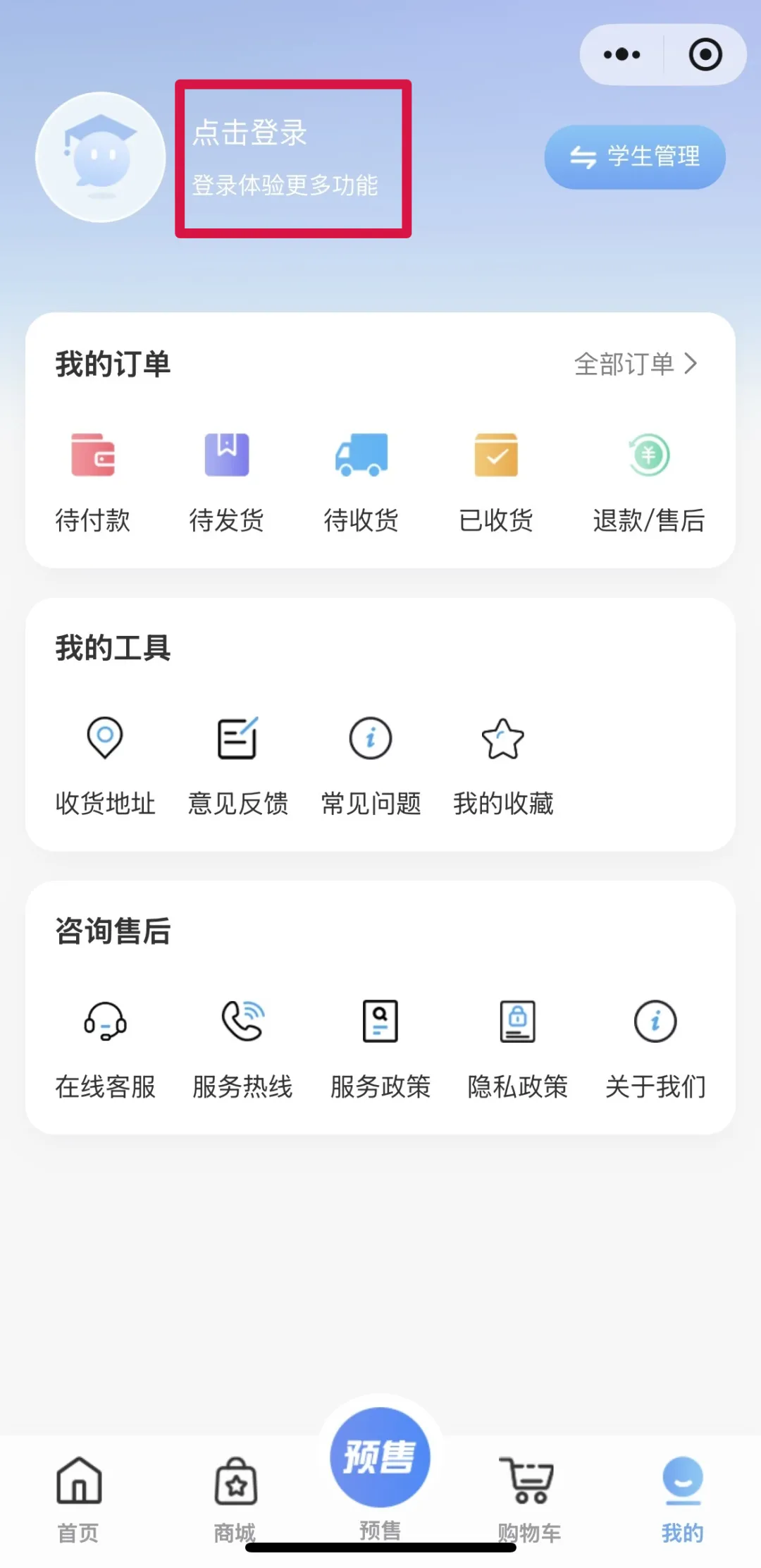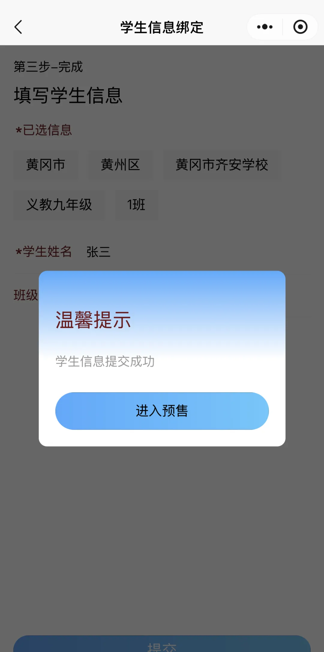 预售平台通过扫描小程序二维码进入,进入微信小程序后,确认学生在读学校信息,准确选择年级、班级,填写学生姓名。(身份证信息可不用填写,如有同班同姓名的学生才必须填写),确保配送信息准确无误。如果填写错误,点击“我的”-“学生管理”-“解绑”,重新录入即可。