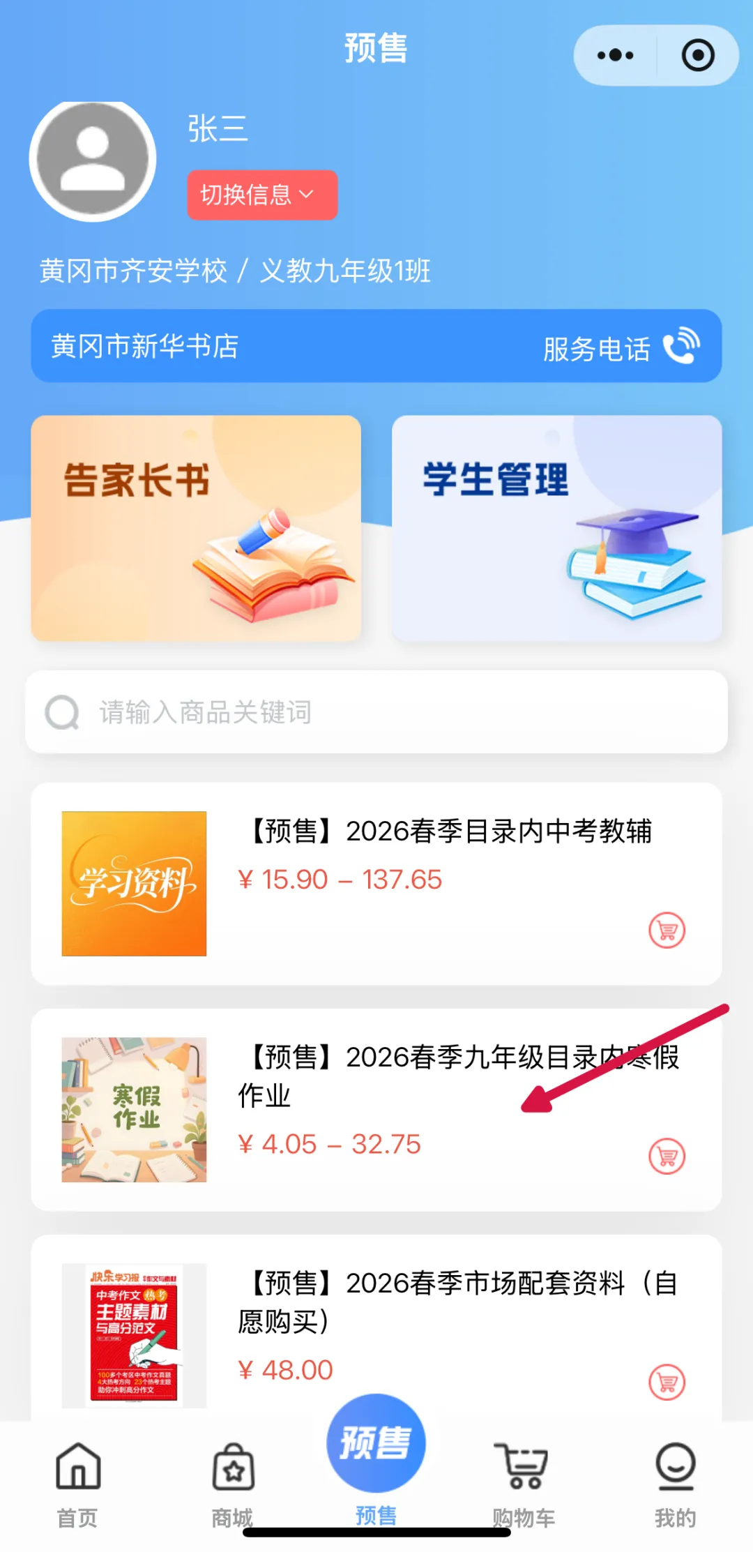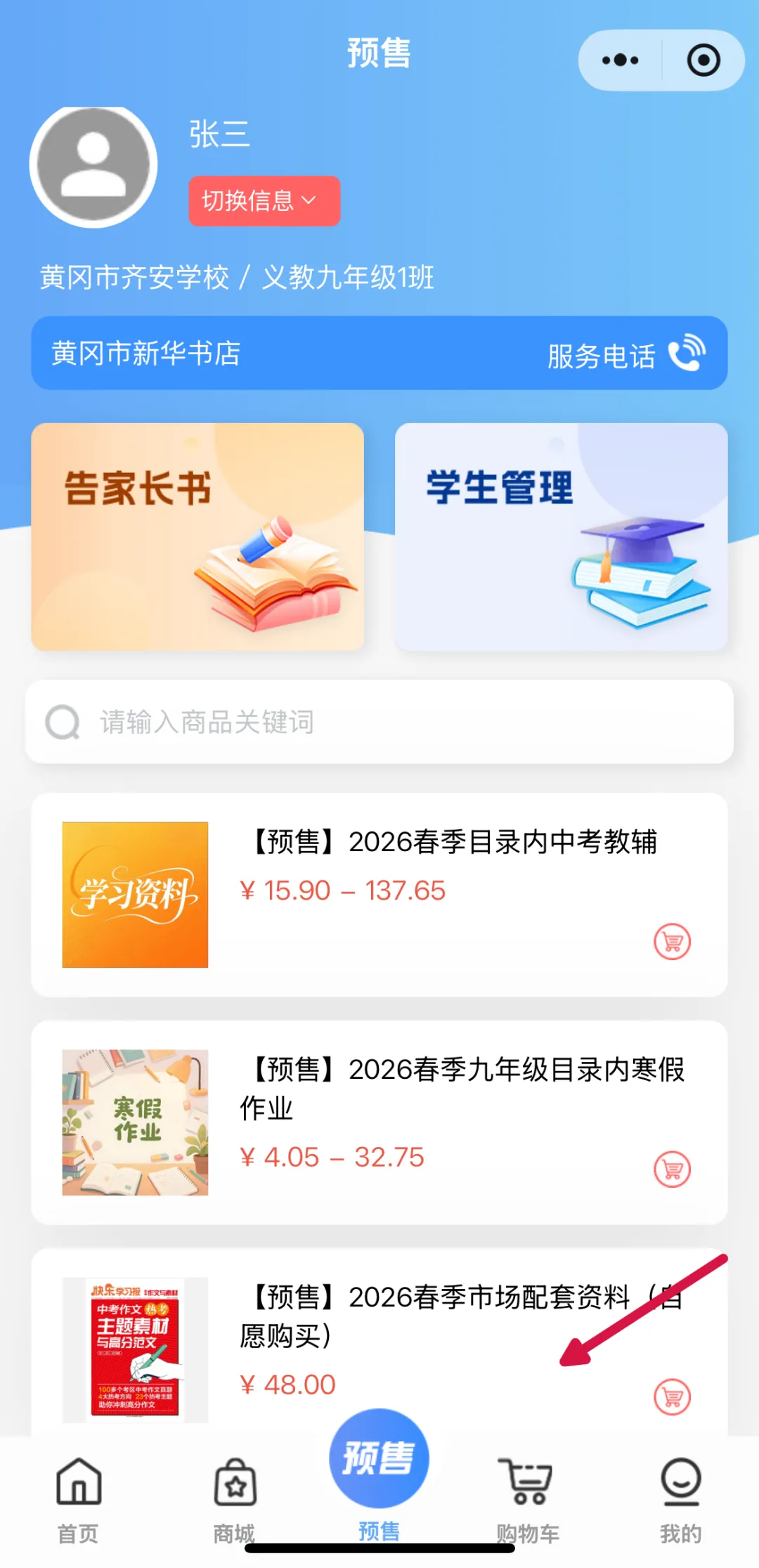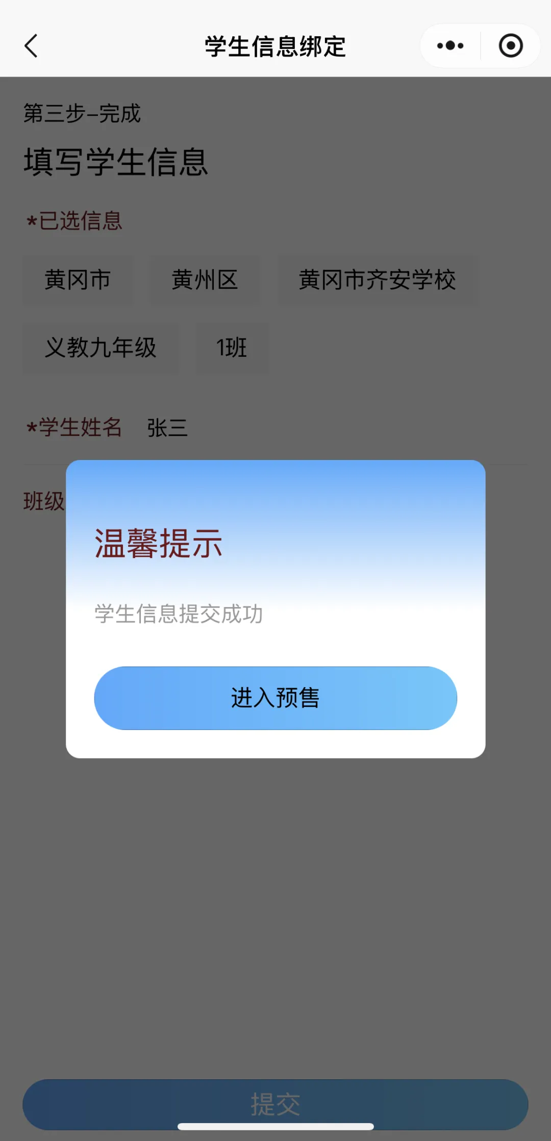 点击“学生管理”→点击“新增”,选择“地区”和“区县”→点击“下一步”,选择就读的学校、年级、班级并填写学生姓名后→点击“提交”,如同一班级无同姓名情况,身份证信息可不填,提交成功后可以进入预售页面。