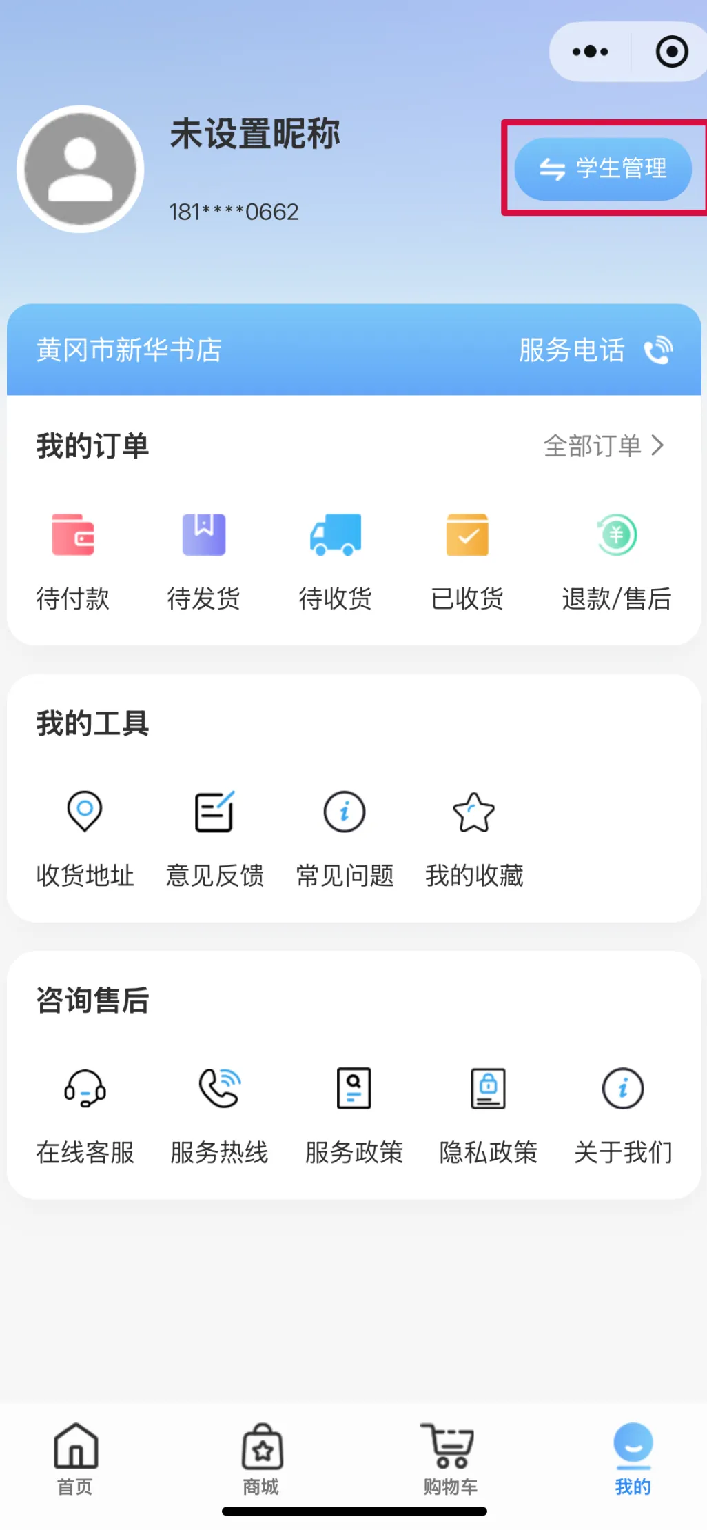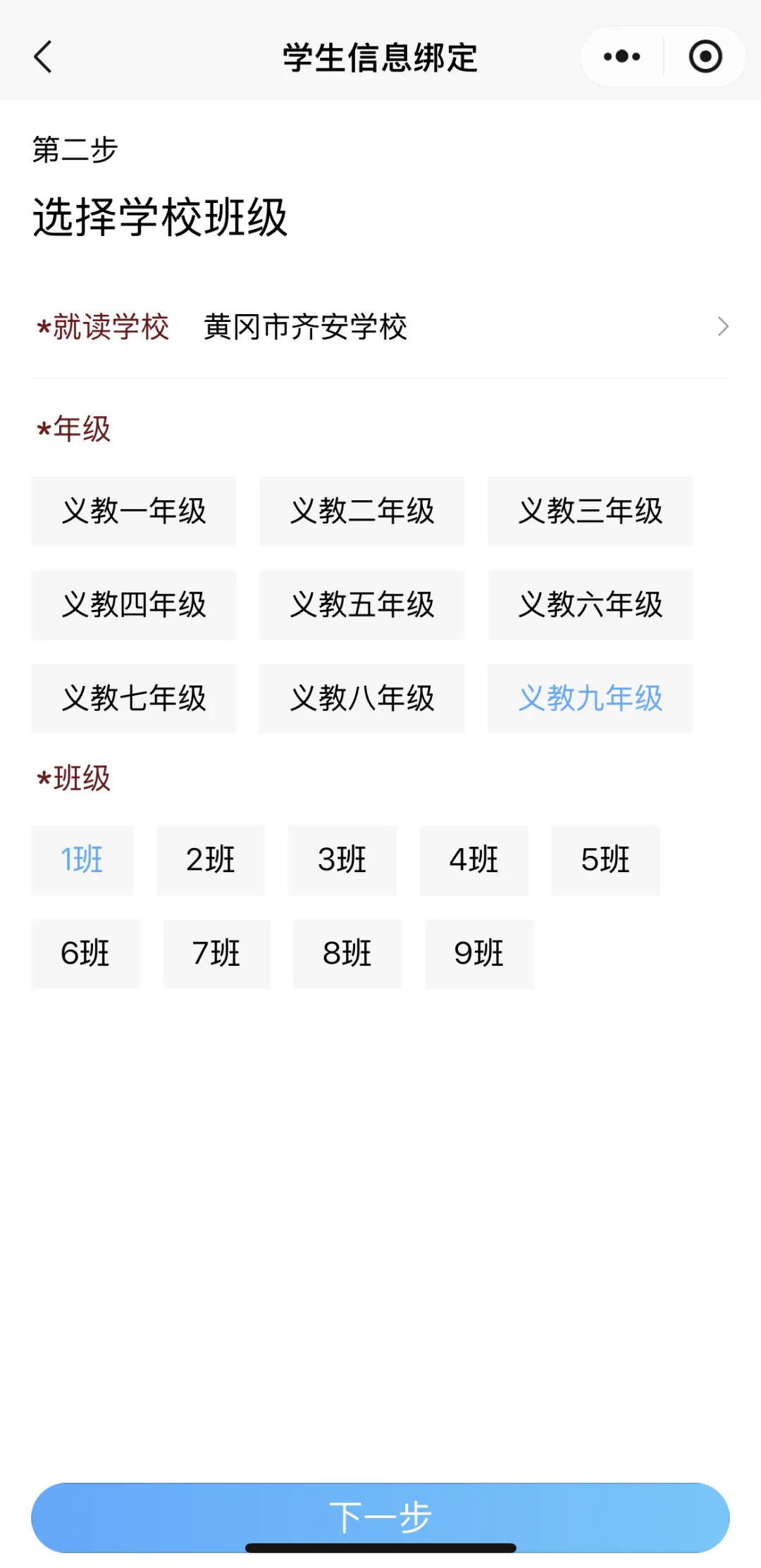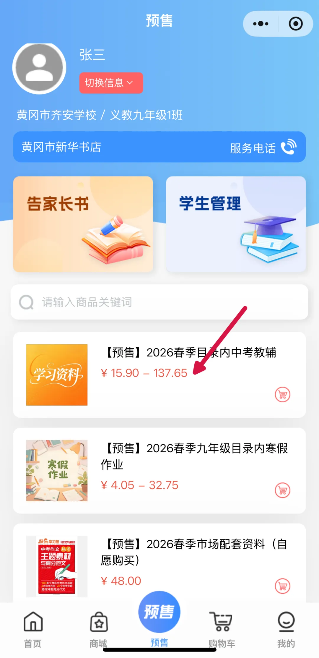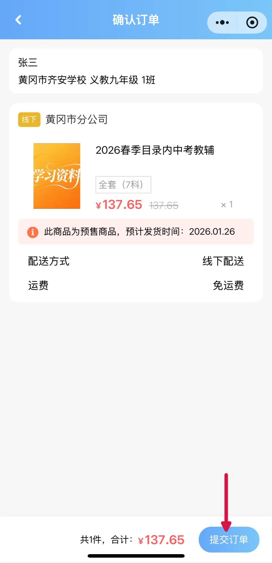 点击“学生管理”→点击“新增”,选择“地区”和“区县”→点击“下一步”,选择就读的学校、年级、班级并填写学生姓名后→点击“提交”,如同一班级无同姓名情况,身份证信息可不填,提交成功后可以进入预售页面。