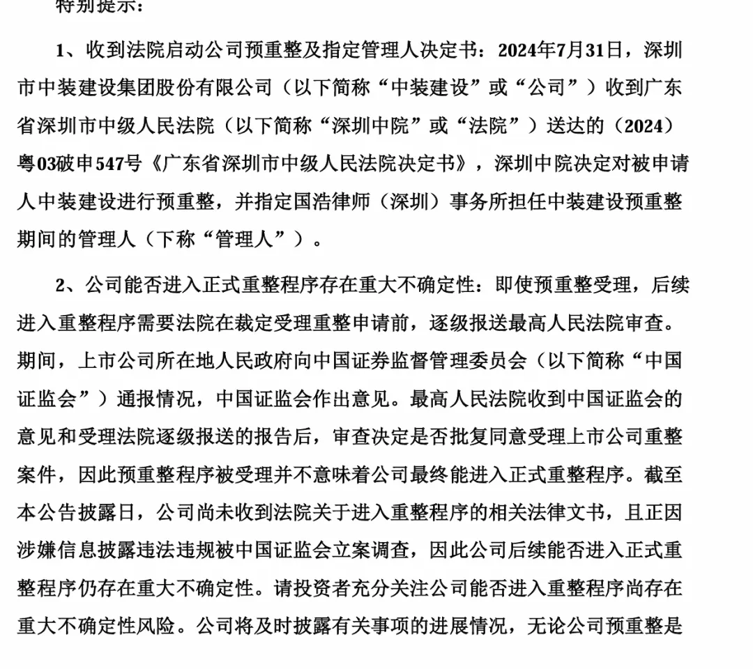 因为中装在24年不是*ST即退市风险提示,所以只要不是面退和重大违法所以当年没有退市风险,从账号被封大多都是企业给不起供应商的货款或债权人的债务所以被法院冻结。对于债权人要想拿到自己的钱就会申请破产重整或清算。