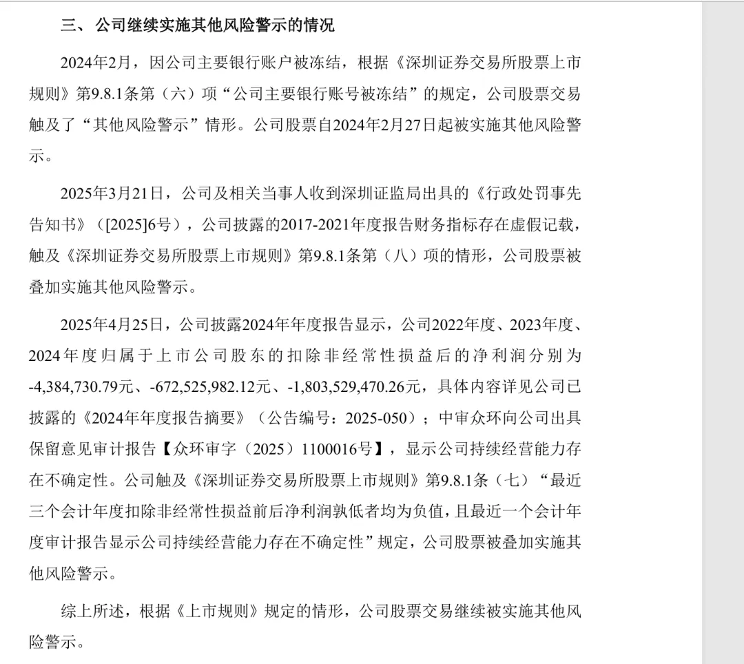 第三项是连续三年净利润均为负值,且最近一年审计报告显示持续经营能力不确定,这个需要出完25年财报由审计后才能消除。
