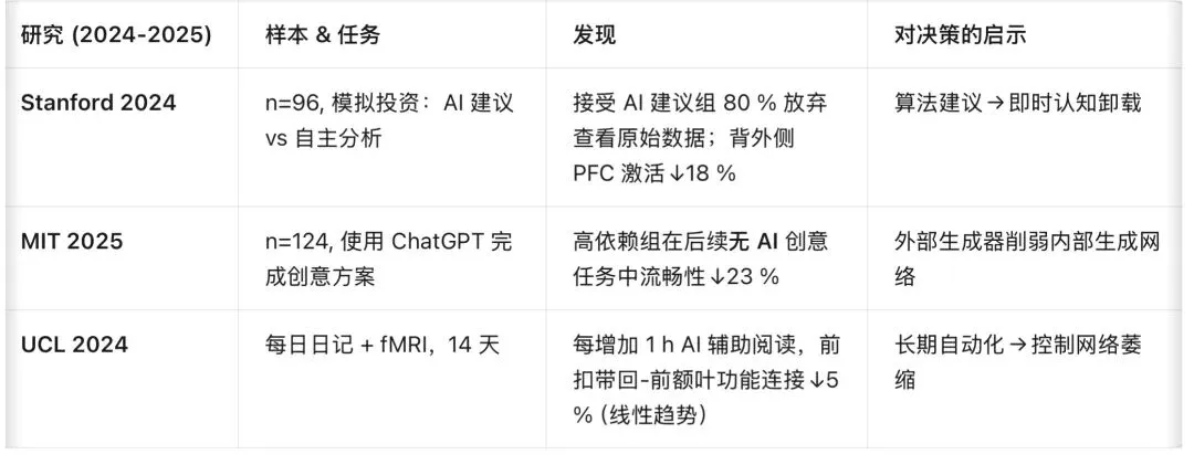 • 背外侧 PFC:执行控制,被 AI 答案绕过 → 活动↓