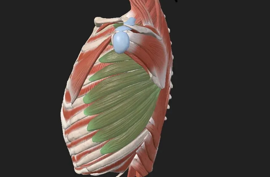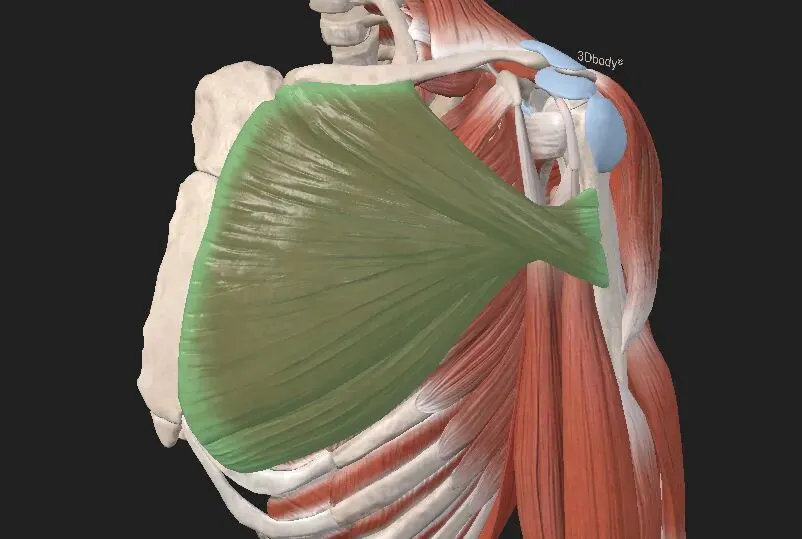 在所有附着于肩关节复合体上的肌肉中,前锯肌被认为是肩胛骨的主要稳定肌。该肌肉起始于第1~8/9肋,止于肩胛骨内侧,其功能