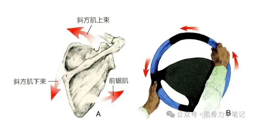 助颈椎侧屈。由于功能相似,斜方肌上部纤维常与肩胛提肌协同作用;但在某些情况下,它们又是相互拮抗(相反)的。例如,肩胛提肌会使颈椎向同侧旋转,此时斜方肌上部纤维将帮助颈椎向对侧旋转。斜方肌上、下部及前锯肌协调工作使肩胛骨上回旋,而肩胛提肌与胸小肌和菱形肌协同工作使肩胛骨下回旋。斜方肌中部与大、小菱形肌协同工作,以后缩肩胛骨。大、小菱形肌