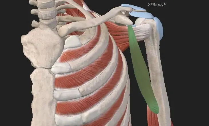 是唯一连接胸廓前侧和肱骨的肌肉,其功能是内旋并水平内收(屈曲)肱骨。例如,胸大肌锁骨部屈曲(从伸展)并内旋肩关节,向对侧肩关节水平内收肱骨。