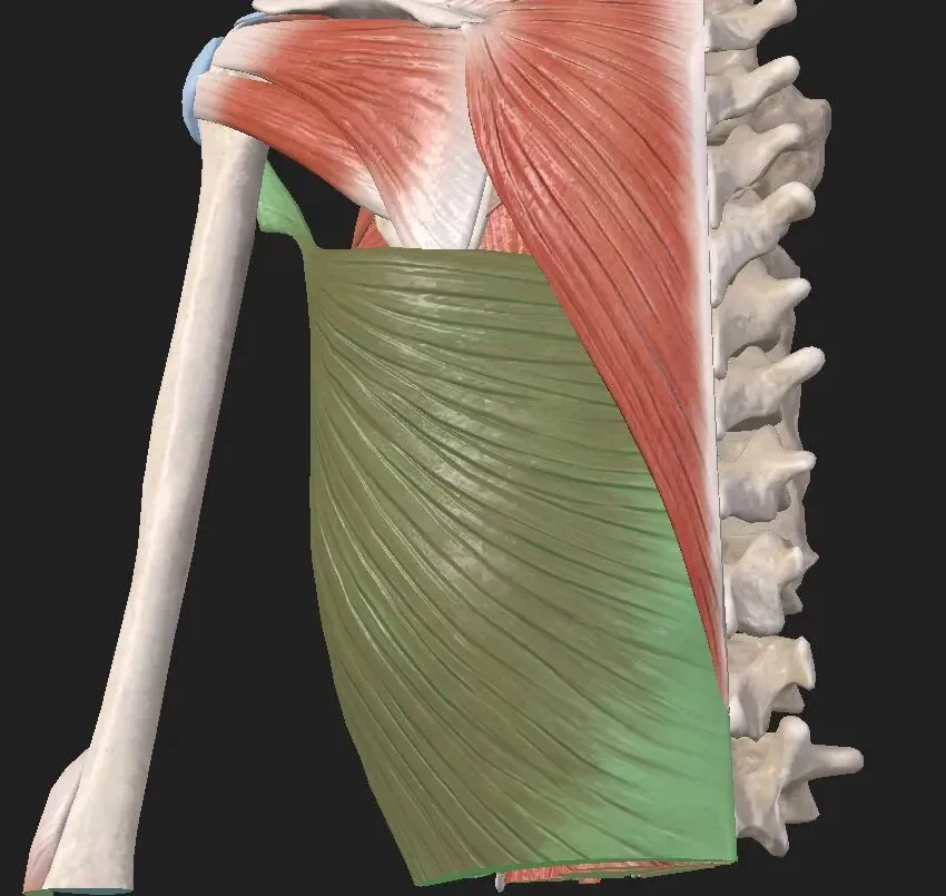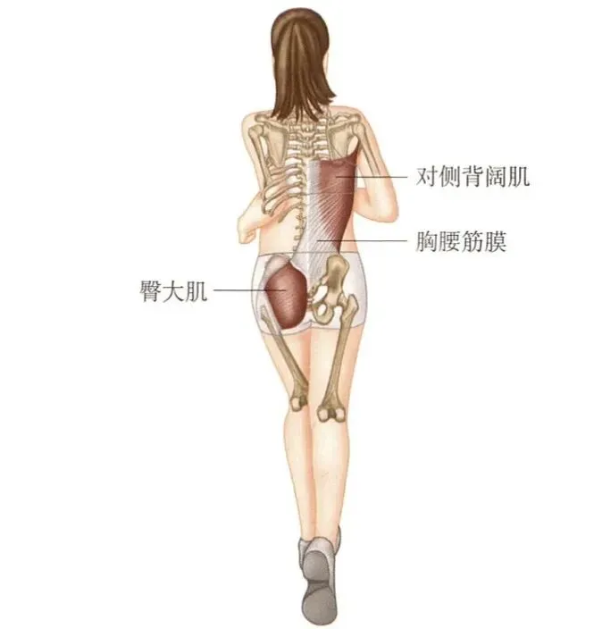 由于背阔肌的斜行纤维交叉并附着于肩胛骨下角,故可通过控制肩胛骨在胸廓周围的侧下方运动来辅助斜方肌下部和前锯肌的活动。该肌肉也是后纵链(外核心系统)的一部分,它连接胸腰筋膜和对侧臀大肌。这些肌肉和筋膜