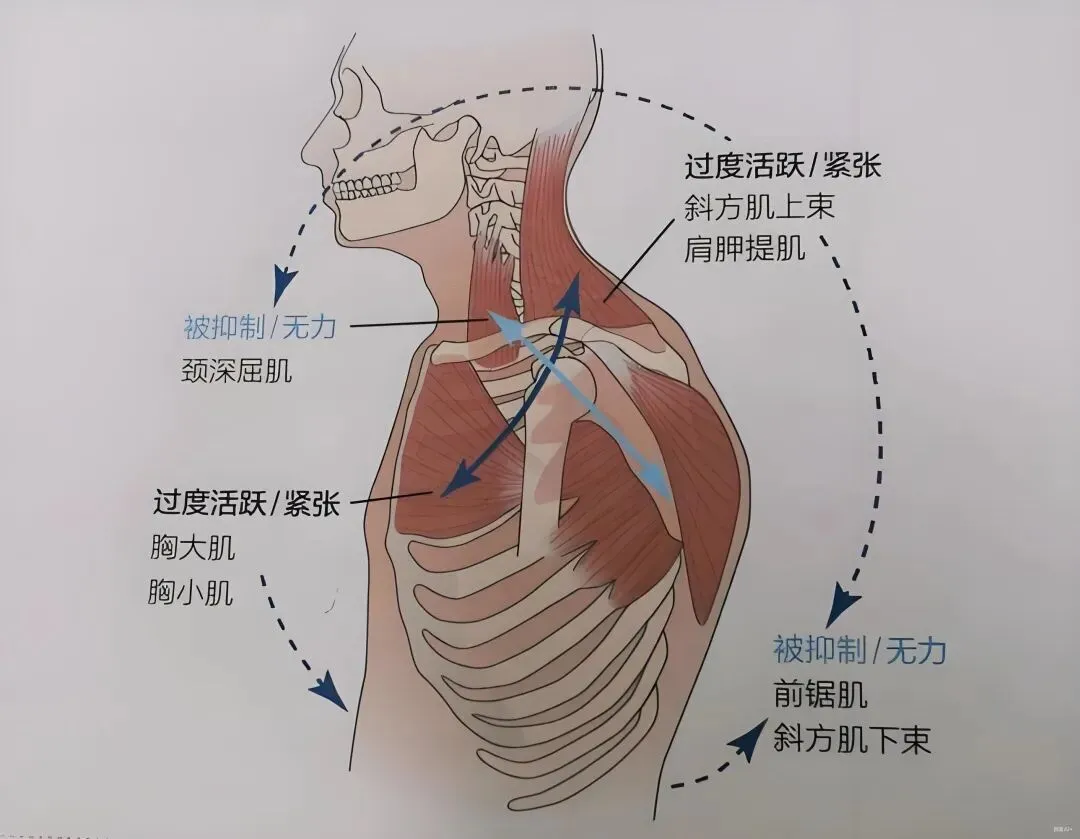 是导致肩胛骨前倾的主要肌肉。如果这块肌肉处于高张力或促进状态,则容易导致肩部前倾。
