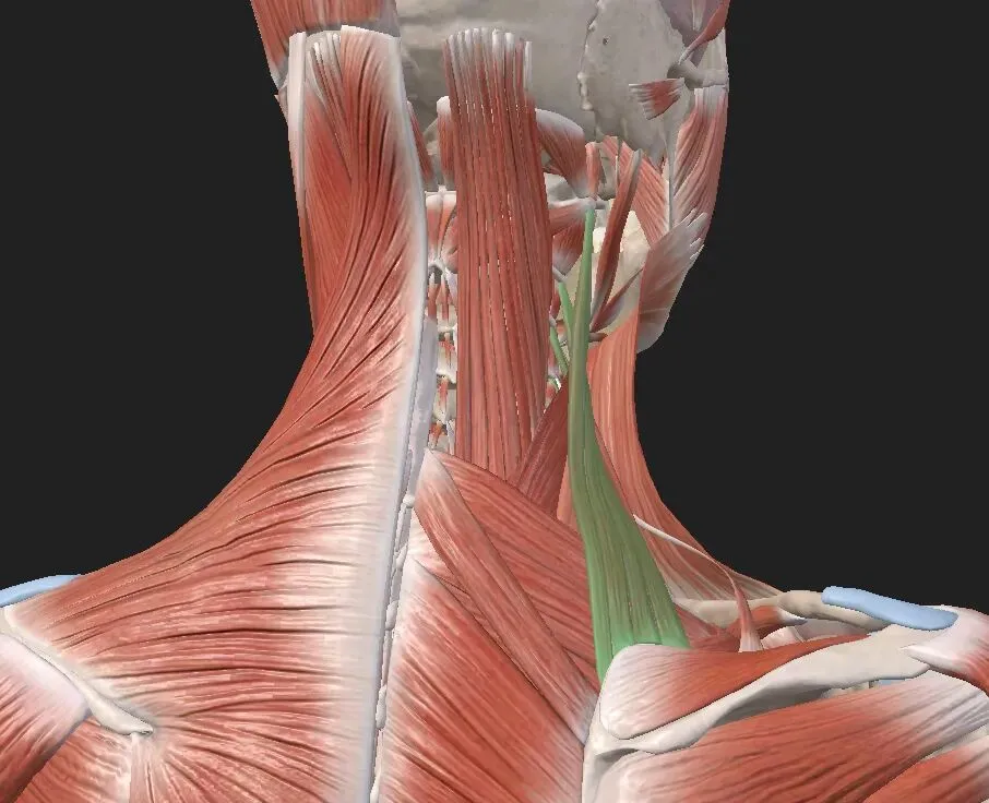 是外核肌筋膜系统的一部分,该系统通过力闭合机制对骶髂关节(SIJ)的稳定性起着不可或缺的作用。背阔肌也被认为是SIJ、腰椎和胸部的主要稳定器之一,并且能够加速和减缓躯干和脊柱的旋转活动。如果由于对侧(相反)臀大肌存在潜在的减弱或抑制而导致背阔肌过度激活或张力过高而无法发挥作用时,背阔肌将代替臀大肌成为SIJ的稳定结构。这种情况下肩关节生物力学将发生改变,这是由背阔肌与肱骨和肩胛骨特定的附着点的位置决定的。这会导致肩胛骨前倾和下降,造成肩胛提肌和斜方肌上部的过度活动。随着时间的推移,反复出现这些不协调的功能模式将导致患者出现颈部和肩部疼痛。