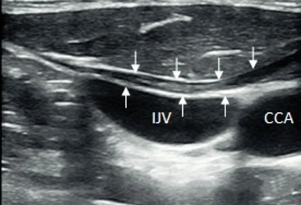箭头示肩胛舌骨肌,IJV 颈内静脉,CCA 颈总动脉
