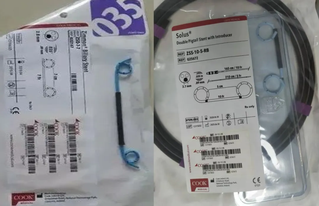 (若先置入10Fr支架,因其直径较粗,且支架非常软,此时活检钳道内还有另外一根导丝,支架置入是非常困难的,所以先放7Fr的支架,放完后导丝撤出,不在钳道内占用空间,10Fr的支架才相对比较容易置入)