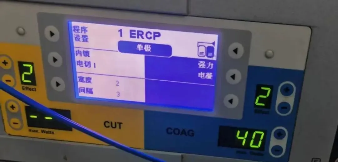 3. 撤出5Fr电刀,剩余的10Fr囊肿刀可以接注射器回抽囊液送检,也可以直接连接吸引管将大部分囊液吸出避免误吸;