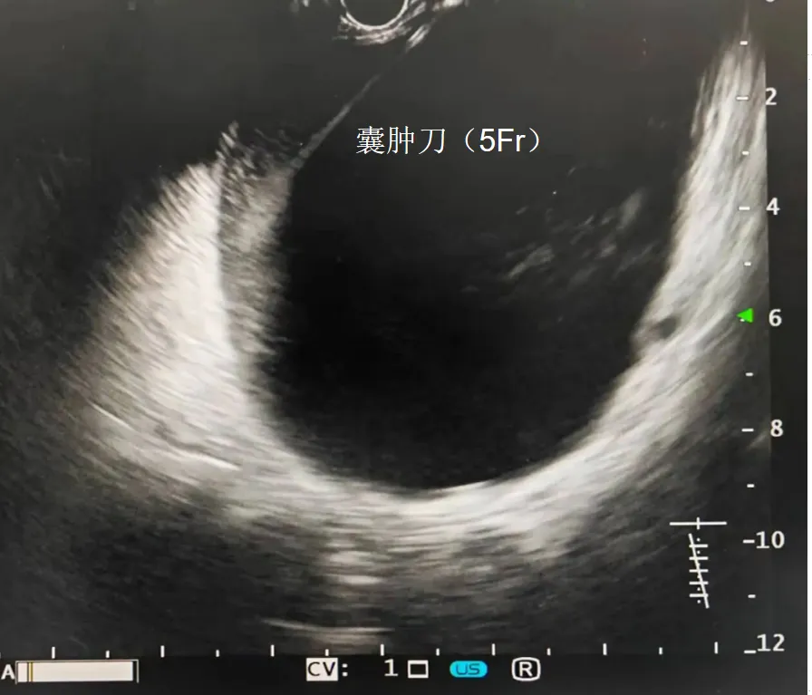 2. 造瘘:5Fr电刀通电穿刺进入囊腔;10Fr电刀通电进入囊腔