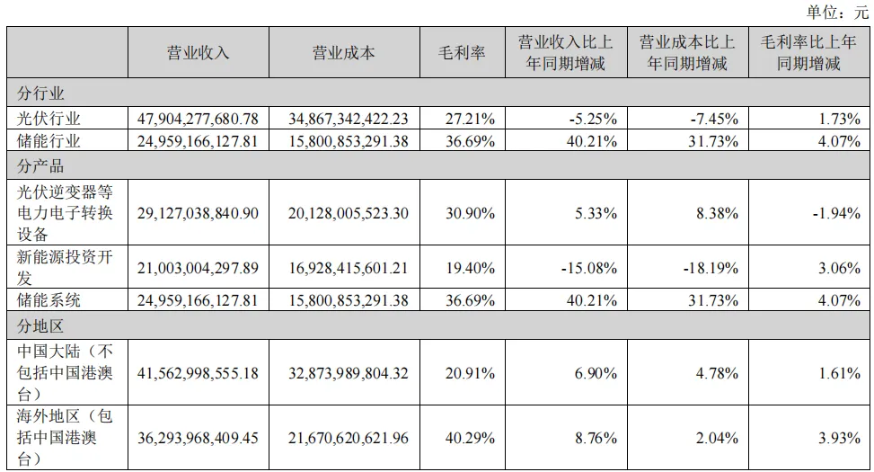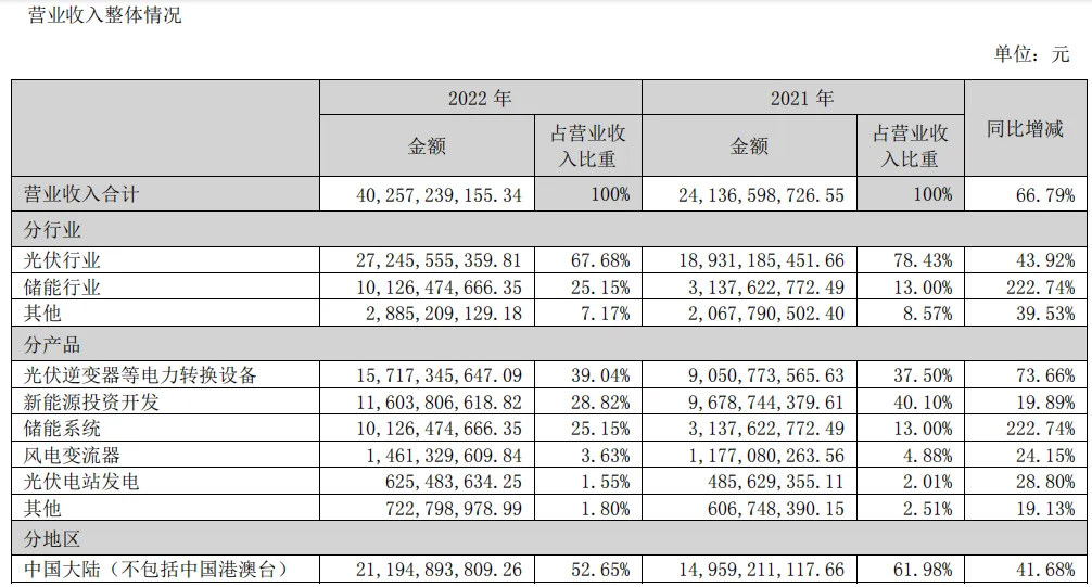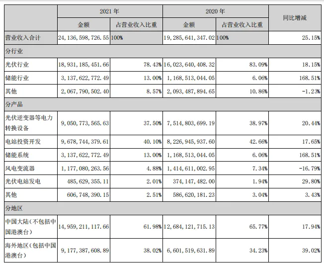 阳光电源核心业务是光伏逆变器,储能投资业务,光伏、储能收入占比从2020年约83%、约6%,转换为到2024年的光伏占比约27%,储能约37%;可以看到一个趋势,当光能、风能转换为更多而不能被完全消费完的电力,就需要被储存起来,阳光电源也准确预判并抓住了这个储能需求,从开始的生产电为主,到现在以存储电为主。下面简单罗列阳光电源各年财报报告收入结构的变化,表格里有详细的业务与产品结构数据,供参阅:2021