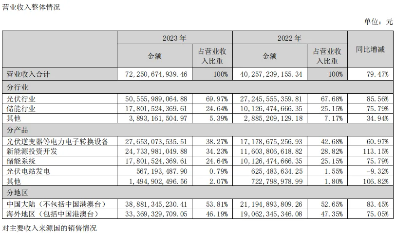 阳光电源是2018-2019行业洗牌后的幸存者,在2020年上市,从财务报表可以看到2020年虽然营收增长,但利润、现金流大幅下滑,这是幸存者的伤疤;2022年业绩爆发至峰值,之后到目前增速趋缓。下面附阳光电源上市后各年年报主要财务指标,表格有各年详细营业指标: