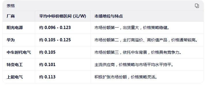 单位生产成本区间在在0.06 元/W-0.15 元/W,从下面的市场份额与单位生产成本可知道,阳光电源的规模与成本优势领先于华为等其他主要厂家。