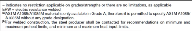 HSS即Hollow structural section空心结构截面(空心矩形、方、圆形管),通常不使用A36和A572进行制作,常见的材料为A500(最常用)和A1085(工艺更优更严格),A500常见的牌号有Grade B (最常用), Grade C, Grade A, Grade D,其中屈服强度Gr.B: 46 ksi (317 MPa)、Gr.C: 50 ksi (345 MPa),抗拉强度Gr.B: 58~85 ksi (400-585MPa)、Gr.C: 60~90 ksi (415~620 MPa),需要注意的是A500在计算的时候要考虑壁厚负公差。(即设计厚度=名义厚度*0.95)