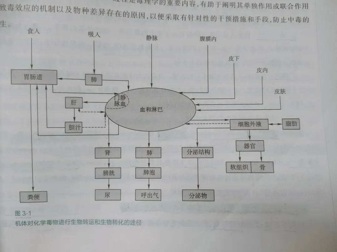肠肝循环(enterohepatic circulation):外源化学物及其代谢物由胆汁进入肠道。一部分可随粪便排出,一部分由于肠液或细菌的酶催化,增加其脂溶性而被肠道重吸收。使得外源化学物生物半减期延长,毒作用持续时间延长。