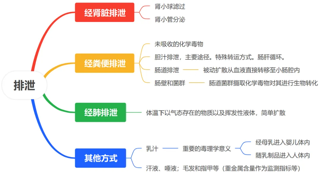 排泄指外源化学物和(或)其代谢物被排出机体的过程。最重要的途径是经肾脏随尿液排出,其次是随粪便排出,经肺部排出(呼气),其他途径如皮肤、乳液、唾液等