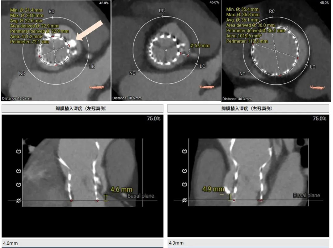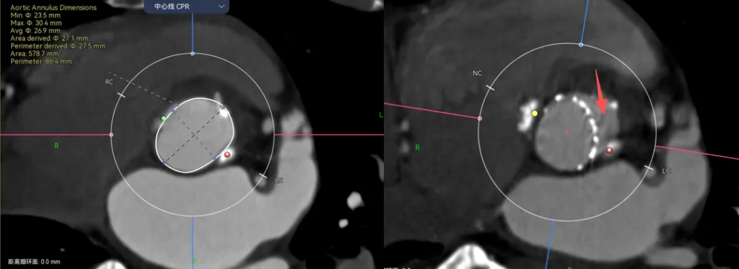 结合下图术后CT可以看到,我对瓣膜位置的预判基本正确,钙化与升主的限制共同把瓣膜推向小弯侧,这时候可以看到瓣膜距离冠脉开口非常之近,如果再贴近一点,瓣膜植入再高一点,裙边或者吊桥可能会有冠脉阻挡风险。所以像这种单边钙化的冠脉风险也是需要看看的。