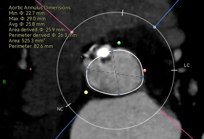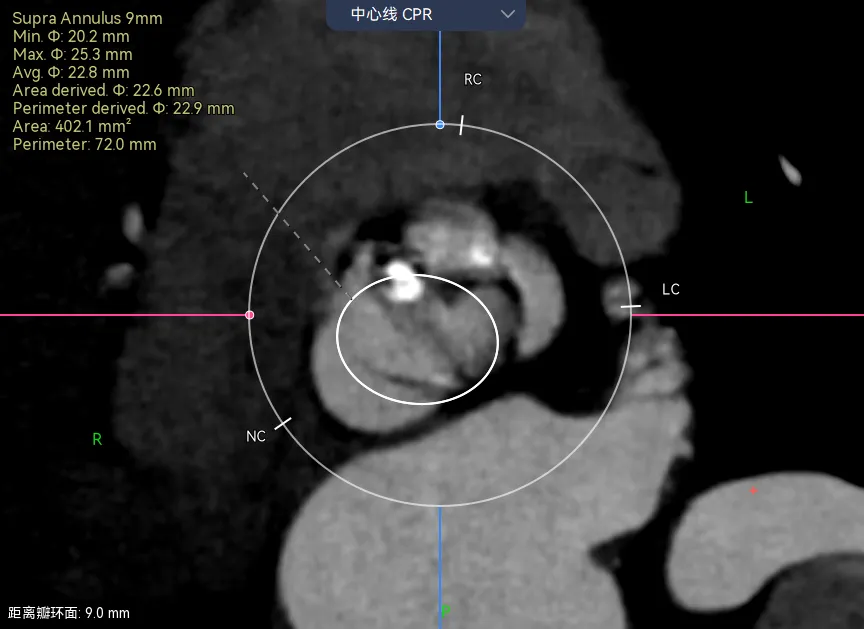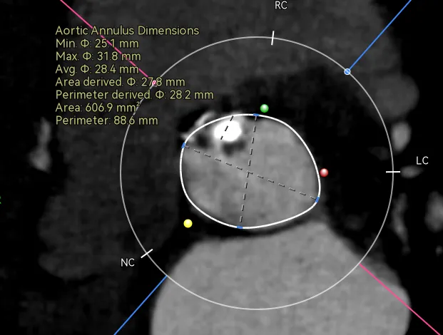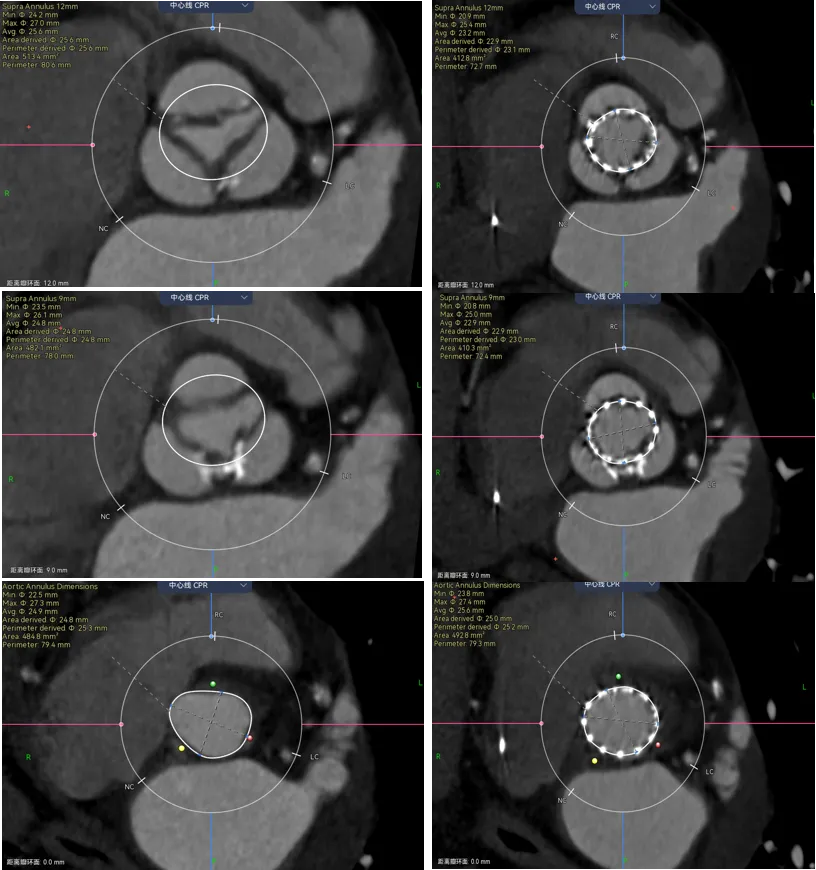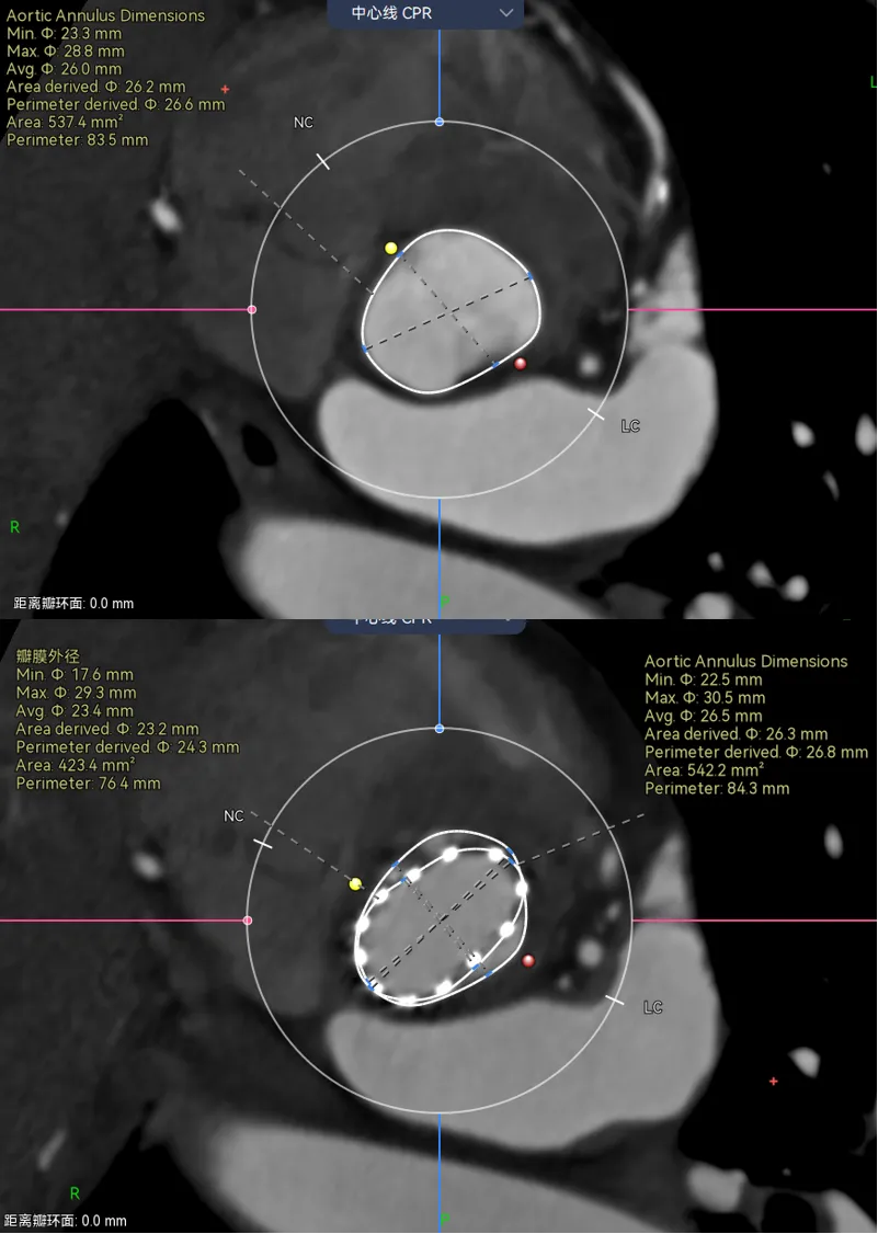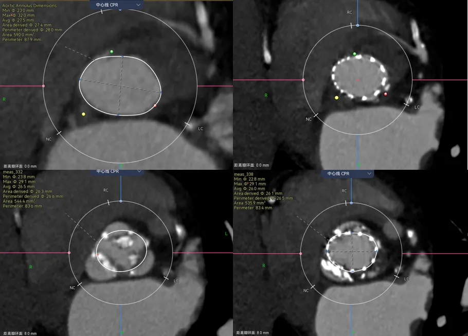 瓣上测量是CT评估中比较重要的一环,也是很吃经验的一个环节,圈画在哪里,画大画小,如何预判瓣膜植入之后大概的锚定区域和封堵区域。以及STJ和冠脉的遮挡可能性,每个技术支持画起来千差万别。
