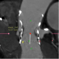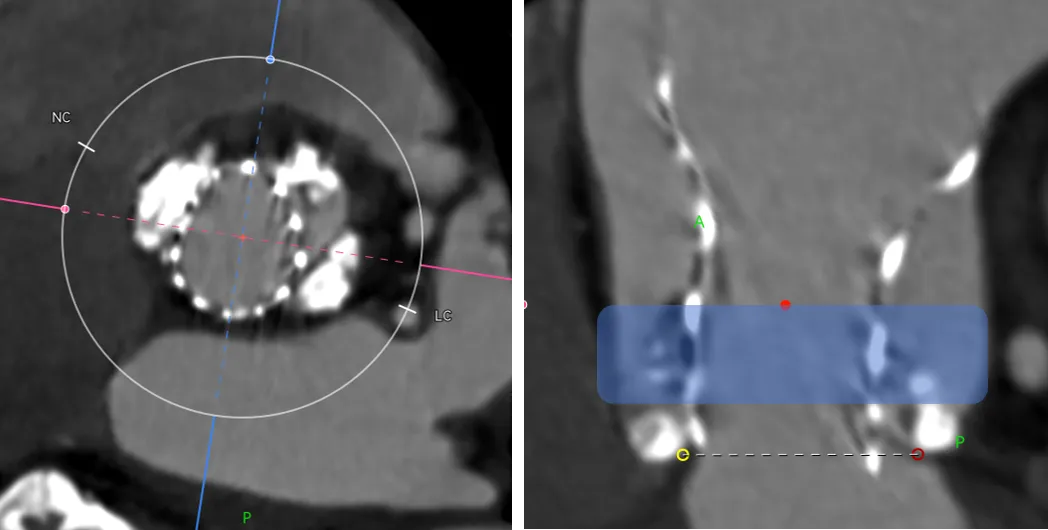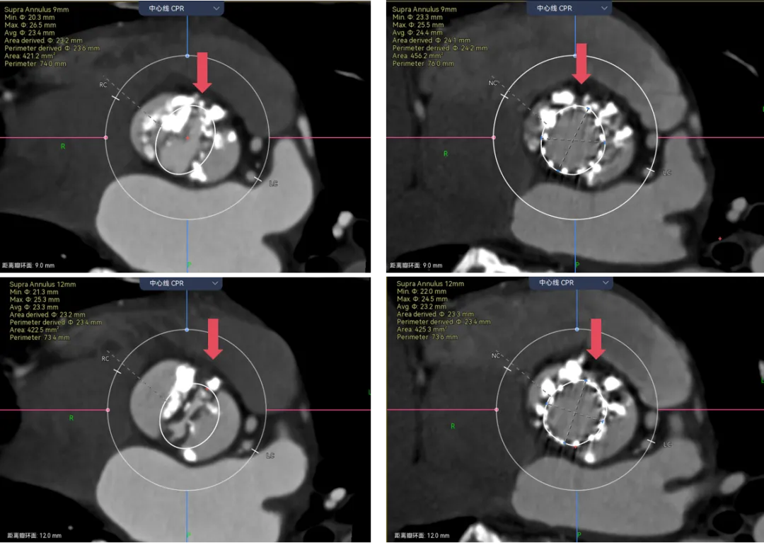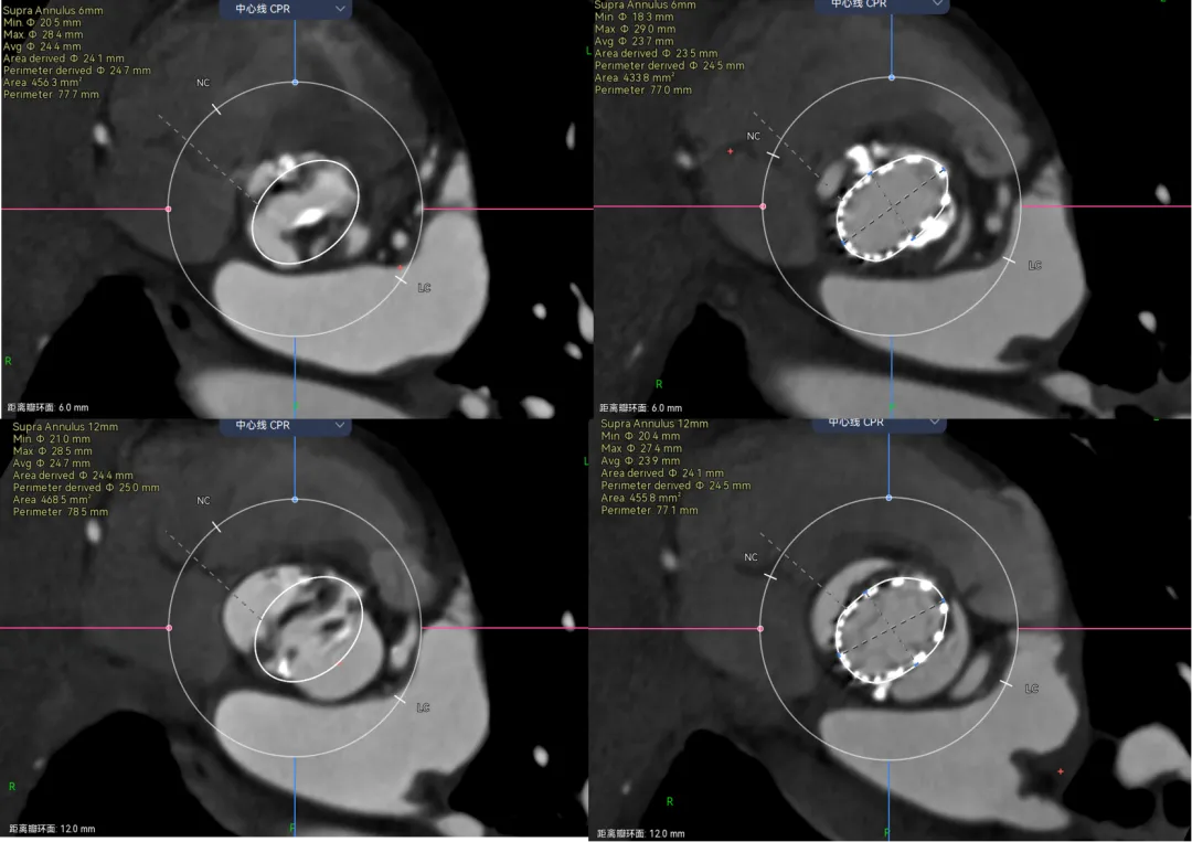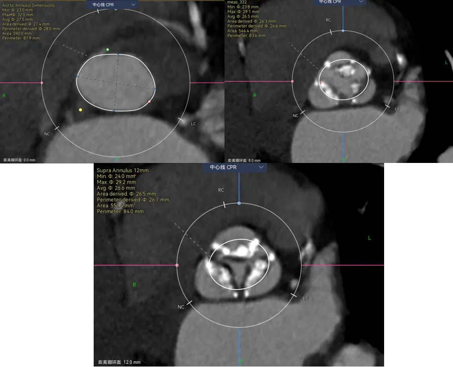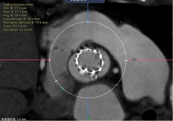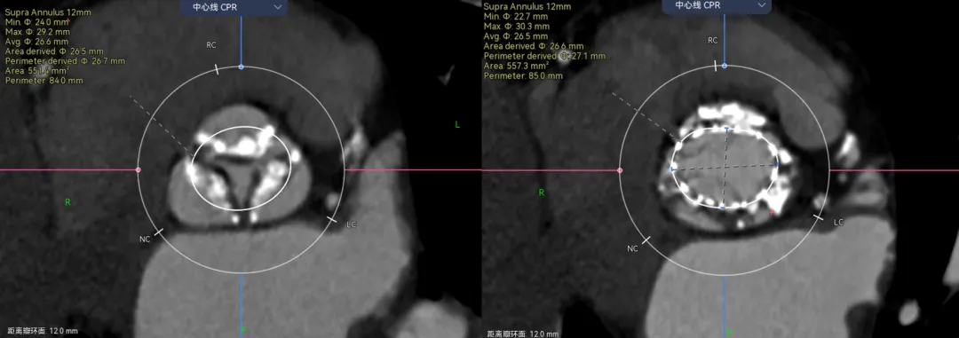 瓣上测量是CT评估中比较重要的一环,也是很吃经验的一个环节,圈画在哪里,画大画小,如何预判瓣膜植入之后大概的锚定区域和封堵区域。以及STJ和冠脉的遮挡可能性,每个技术支持画起来千差万别。