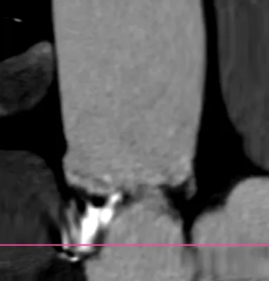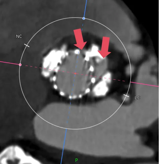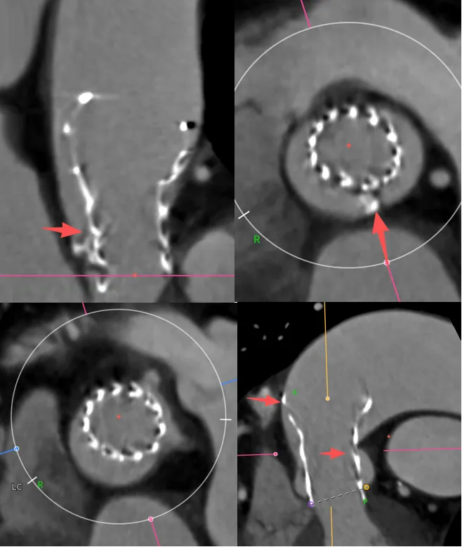 病例1 - 钙化集中在大弯侧,将瓣膜像小弯侧推挤,单边钙化要注意识别冠脉风险,并不是二叶瓣就没有冠脉风险了。可以看到图中的瓣膜距离冠脉开口很近。