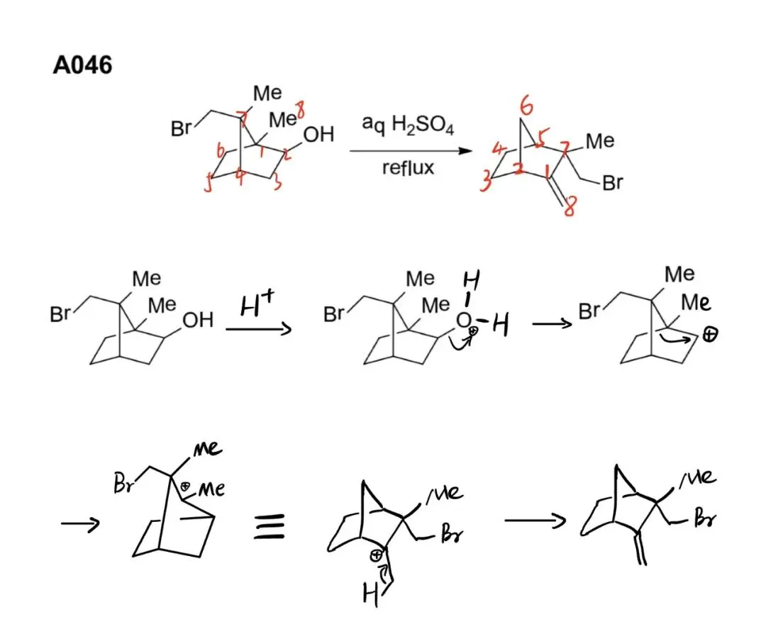 A046 涉及到桥环的一个特殊反应。为方便理解机理,对重点基团编号如下图笔记,醇质子化后,水分子离去得到2号碳的碳正离子,要发生碳正离子重排,此碳正离子为非经典碳正离子。关于碳正离子的重排,需要逐个分析哪个烷基迁移,若是8号甲基迁移,会得到1号桥头正离子,不稳定,且后续会得到桥头双键,也不稳定。所以6号碳迁移到了2号碳正。最后发生一步E1消除,得到烯烃。