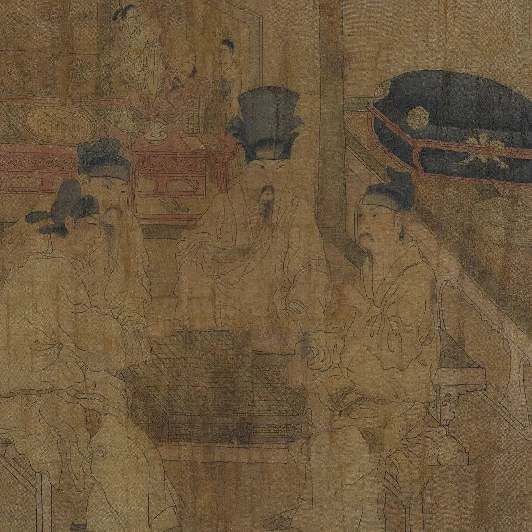 《重屏会棋图》是战笔水纹描的经典之作,绢本设色,纵40.3厘米,横70.5厘米。画中人物衣纹呈现典型"屈曲战颤"特征,衣褶线条以方折顿挫为主,肘部转折处采用连续"S"形波纹,既符合织物自然垂坠规律,又通过笔势颤动暗示人物肢体动作。作品证明该技法在五代时期已形成成熟运用体系。
