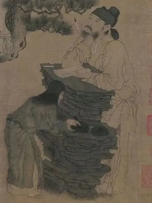 《文苑图》又名《琉璃堂人物图》是战笔水纹描最典型的范本。画中人物造型传神,笔力极佳,线描勾勒时提按徐疾有度,线条的粗细变化也很明显,有书法线条的韵律感。人物衣纹线条用中锋劲利笔法,转折处方折硬转,如战笔般颤动有力,充分展现了该技法在表现文人雅士时的艺术魅力。