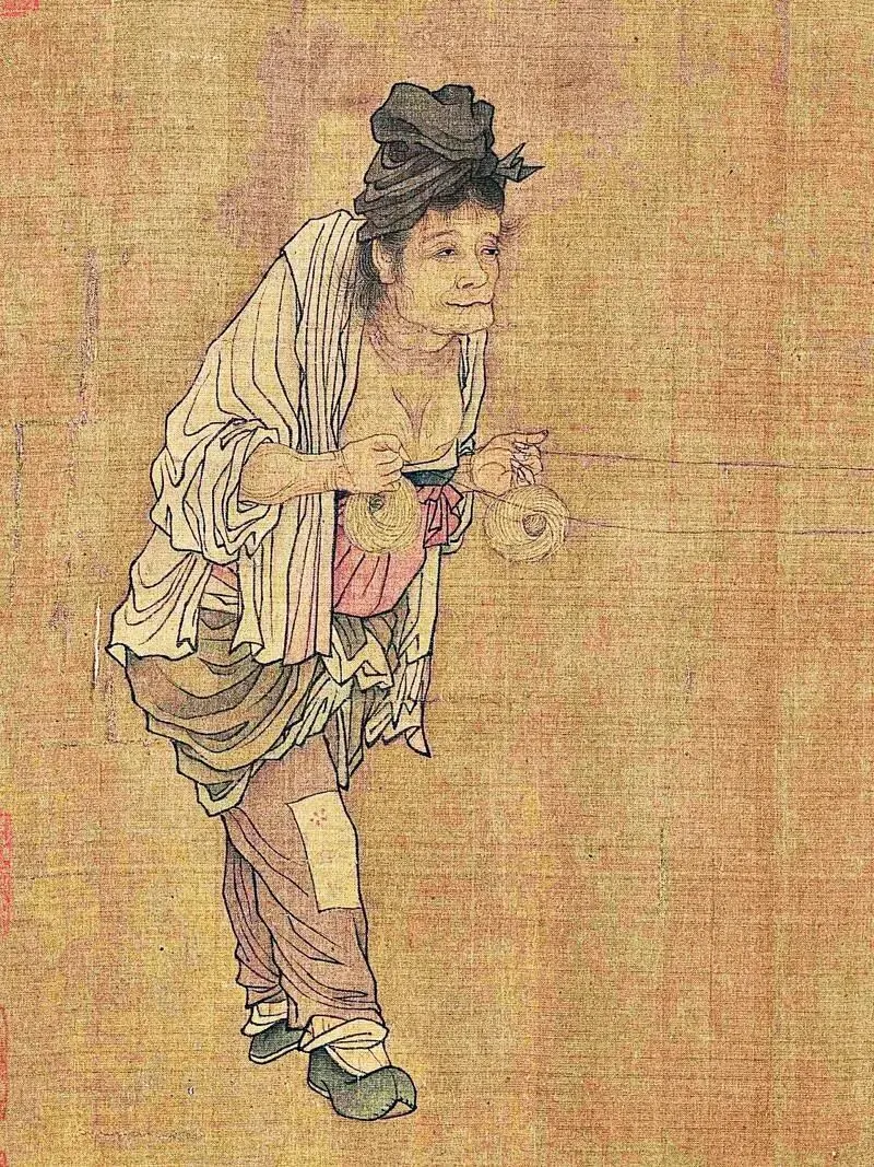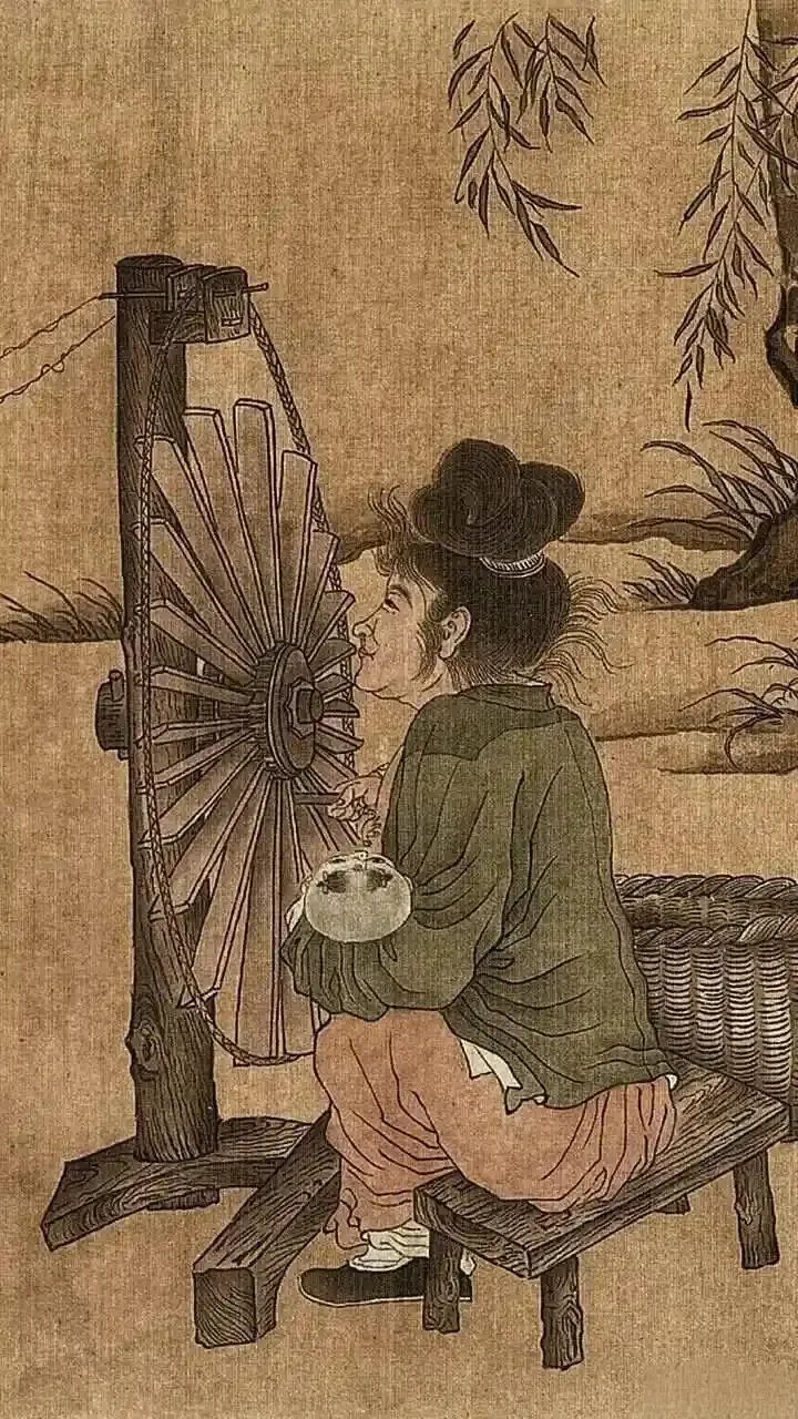 《纺车图》中的人物衣纹也是学习了战笔水纹描的方法,且线形也化圆为方,这一现象类似《听琴图》,但行笔中的顿挫感却有所减小,书写的韵致不如《文苑图》,体现了该技法在不同画家笔下的个性化表现。