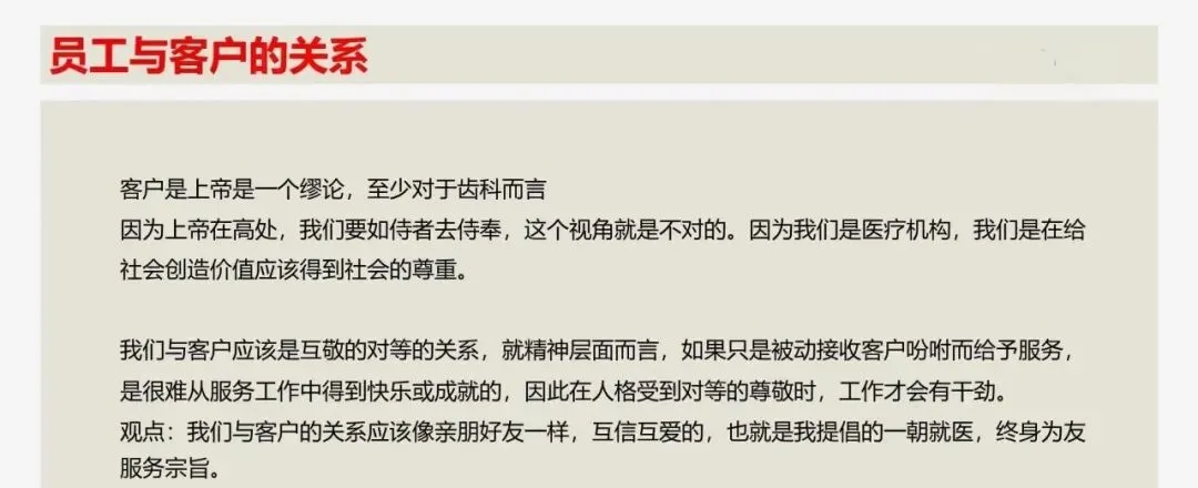 我跟大家理清两个观点。两个观点:第一个是我们员工跟客户之间到底是什么样的关系。我们在实践过程当中,有很多的口腔机构口口声声的说要把客户当成上帝,但其实很多口腔机构都是做不到的。这样下来的话我就觉得可能是比较虚伪,很多客户他的需求其实是很多的,我总结我们说客户是上帝,对口腔机构而言是一个谬论。