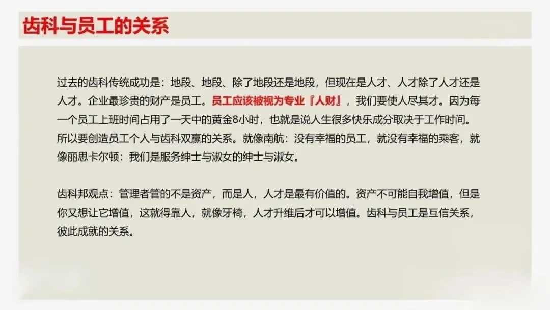 第二个口腔机构与员工到底是什么关系。大部分的口腔机构会把员工当成一种工具。 过去口腔机构盈利靠的是地段。现在人才是企业最珍贵的东西,也是最珍贵的财产。员工应被视为专业的人才,我们要人尽其才。我们让每一个人都能够让他在自己擅长的领域做的非常好,这个是使人尽其才。