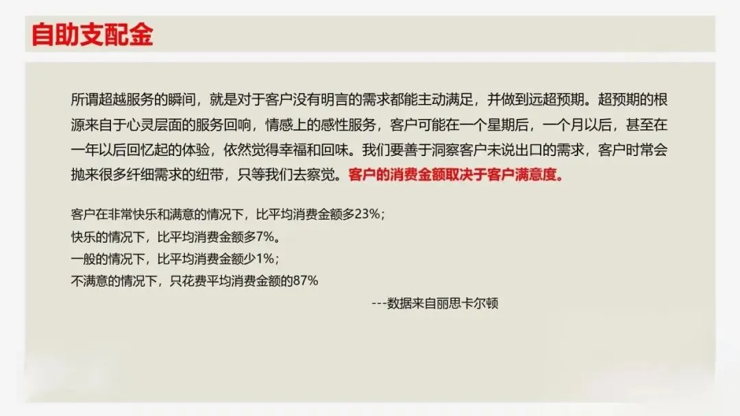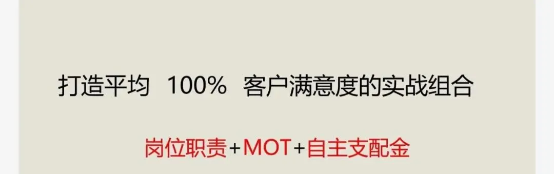 打造平均百%客户满意度的实战组合,这里面有三个非常重要的点。第一个岗位职责,第二个mot,第三个是自主支配金。