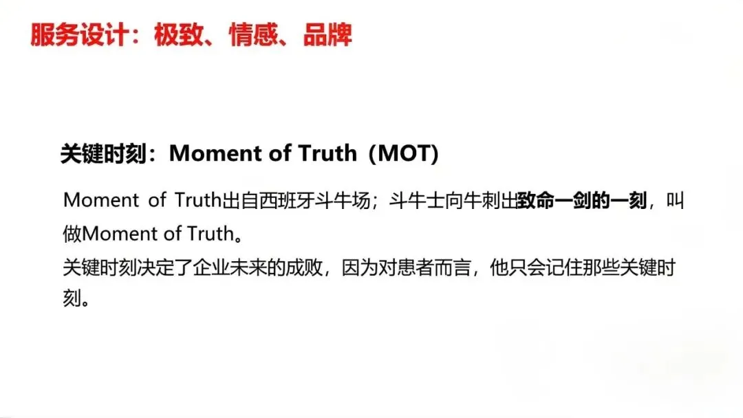 今天我给大家讲的最重点的就是 Mot moment of truth,mot 是来自于西班牙的斗牛场,就是斗牛向牛刺出最致命的那一剑叫 moment of truth。我们中文名叫关键时刻。关键时刻决定了企业的未来的成败。因为对于患者而言,他只会记住那些关键时刻。