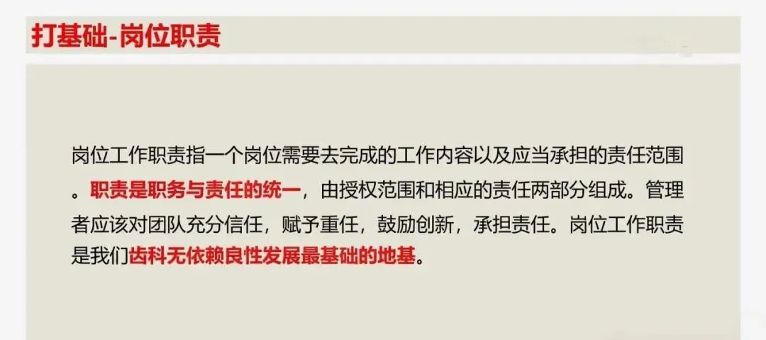 我们首先看岗位职责,岗位职责其实它对于打造百%客户满意度的工作里面,他只不过是做了一个叫什么打基础的工作,如果说当我们自己的口腔机构连每个岗位的岗位职责都没有,其实在我认为这家公司的客户满意度一定不会一定不会特别的高,岗位职责是什么?它指一个岗位需要去完成的工作内容。其实简单的说他就是职责是职务与责任统一,我们必须要把每个岗位每个人他有哪些职权利以及他有哪些责任,然后我们通过书面的方式形成一个体系化。