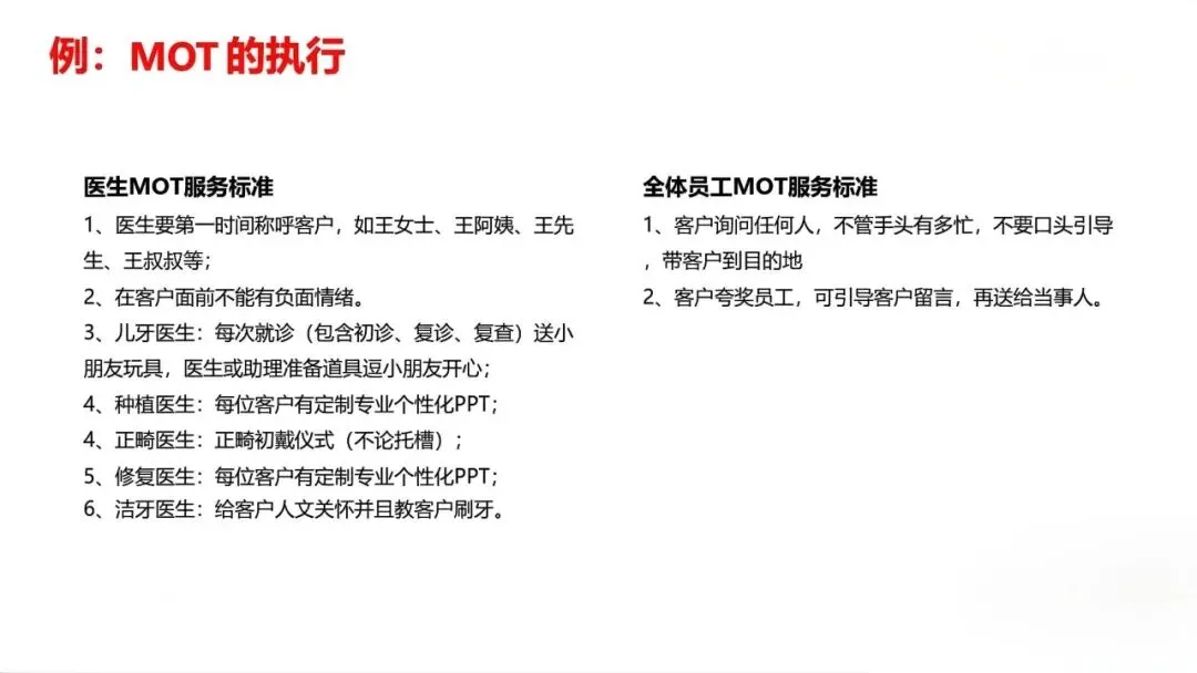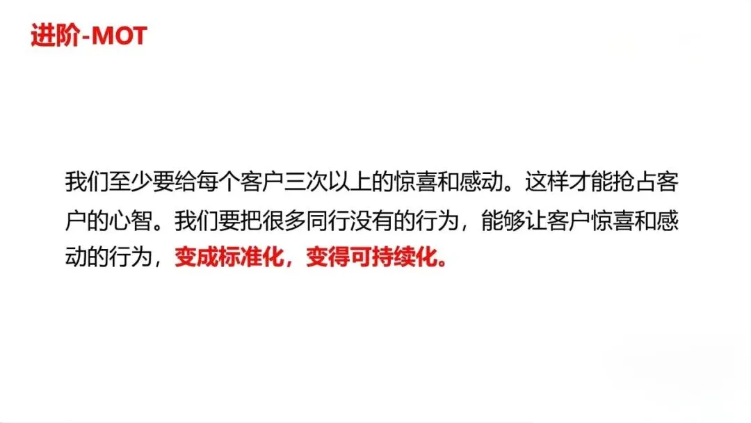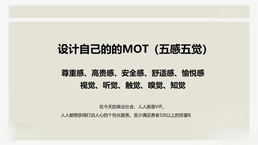 Mot是我们真正做到一个进阶的工作。就是我们至少要让每一个客户每一次就诊要有三次以上的惊喜和感动,这样才能抢占客户的心智。