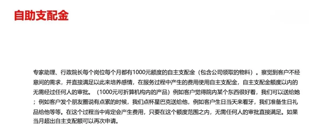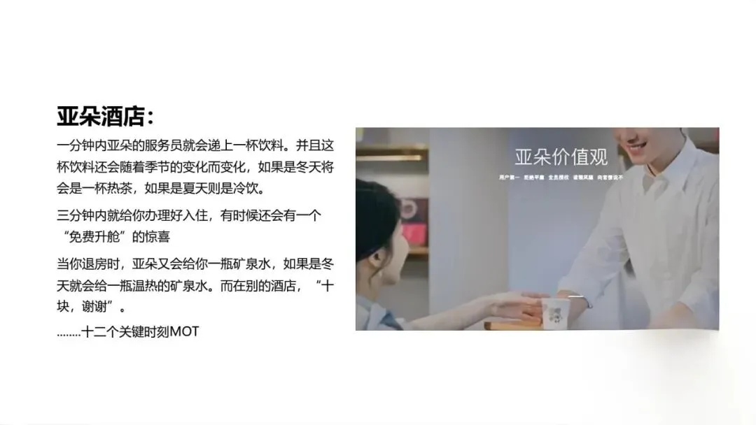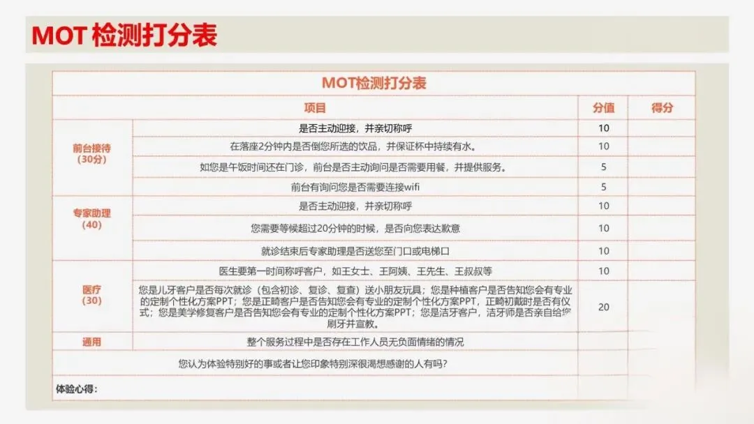 Mot非常好,怎么去监督他呢。大家可以看到是这样的表格。我们会把前台专家助理医疗包括通用,我们都会用分值的方式给列出来。我们会当月抽几个老客户,把表给他让他打分,后面通过表格就知道做的好不好。我们关键时刻点就是对于客户没有明言的需求都能够主动满足,并做到远超预期,超预期的根源是来自于心灵层面的服务回响,情感上的感性服务,客户可能在一个星期以后一个月以后,甚至在一年以后回忆起的经历,这种体验依然觉得幸福和回味。