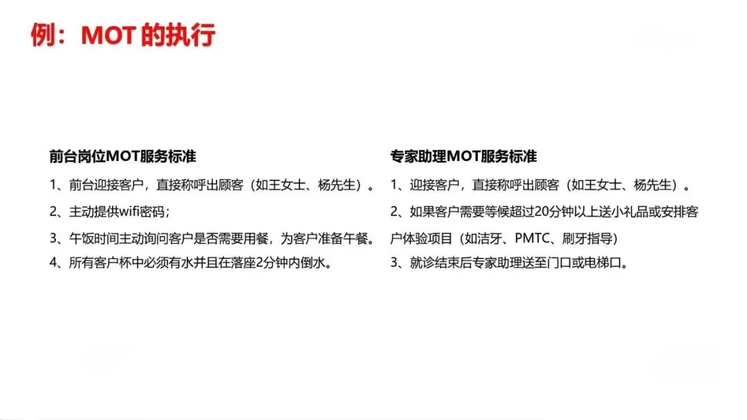 口腔机构的MOT执行4个标准。第一个前台他需要做4个Mot,第一个前台迎接客户直接呼出顾客的姓名。因为我们每家口腔机构它都会有这个his系统或者SARS系统,当患者他预约好了之后,假如他预约的是9点,我们在9点的时候我们就知道客户他是王女士或者是杨先生,所以说我们在 mot设计当客户来到前台之后,我们前台主动迎接你好王女士9点你准时到来了。我见过很多的口腔机构都会这么去做,请问你叫什么名字?你约的是几点,你跟谁预约的?你是哪个医生是吧?其实这样的形式会让我们的客户比较反感。