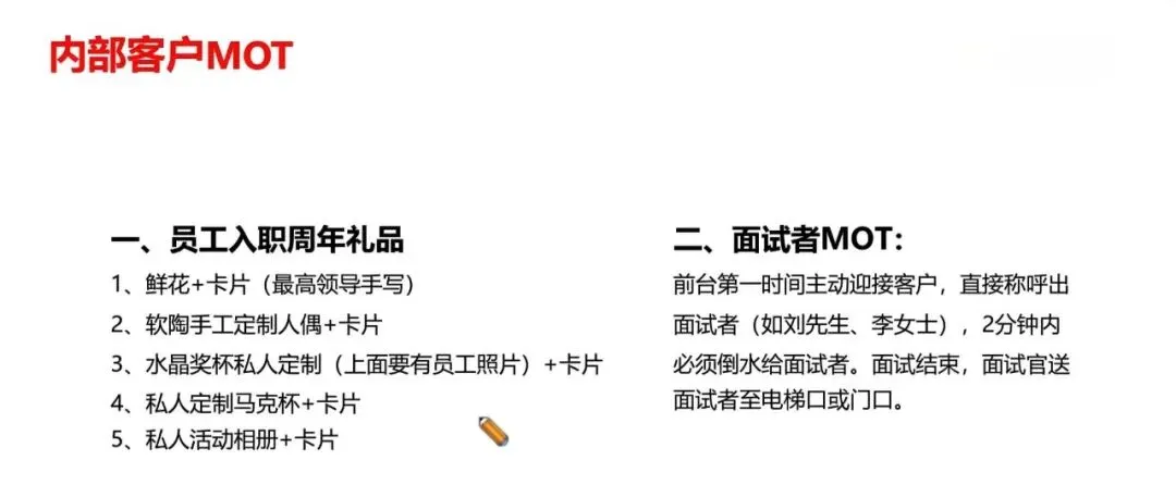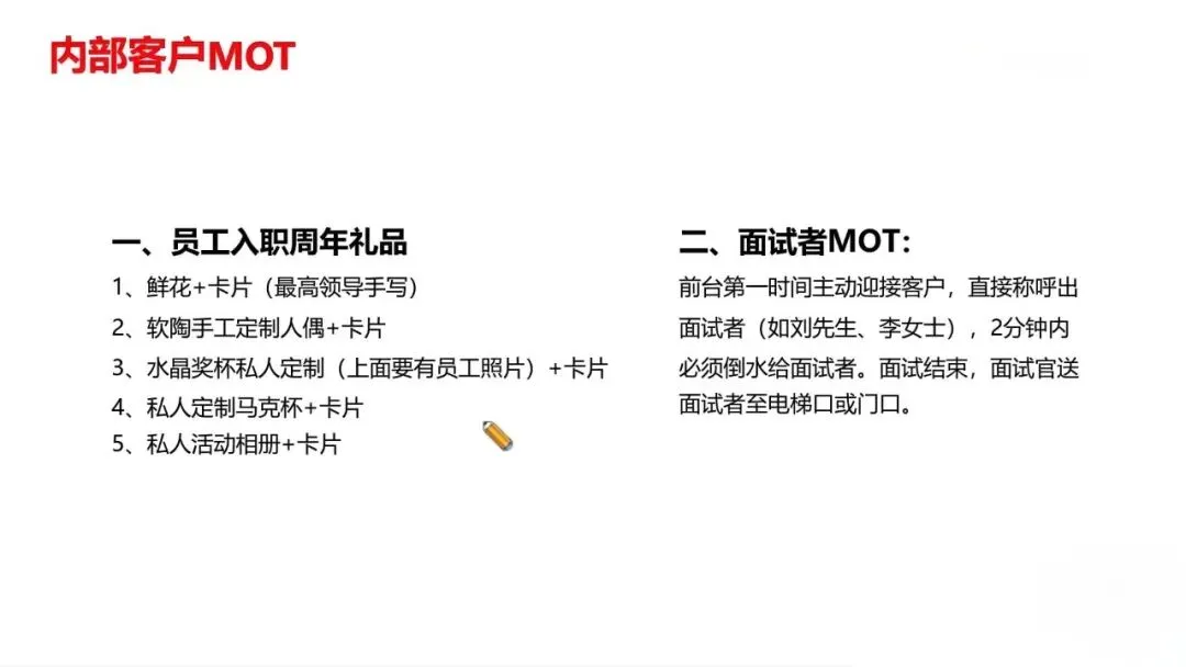 全体员工MOT标准:所有人面对客户的时候,我们的服务的mot第一个客户询问任何人,不管手头有多忙,不要口头引导我们直接带客户到目的地。