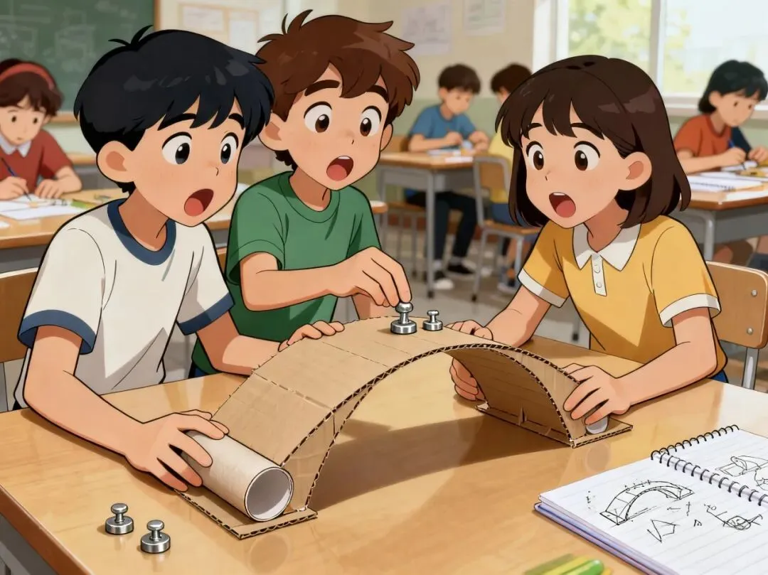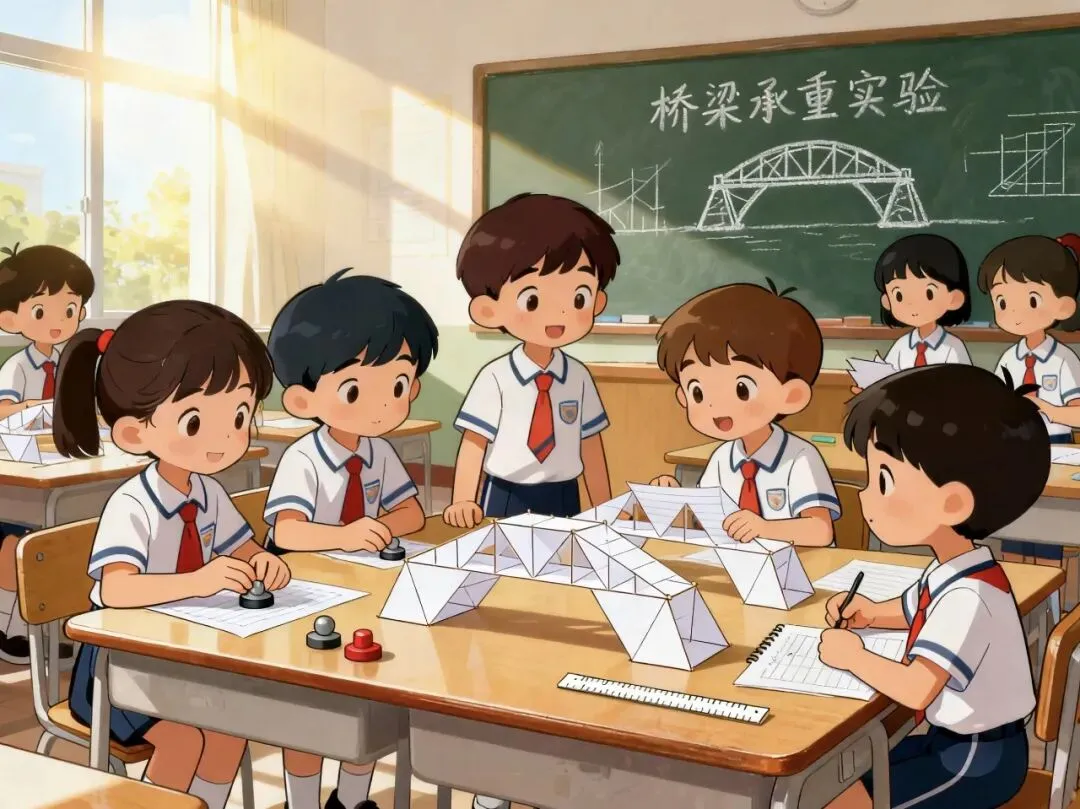 高段课堂则化身“桥梁小工程师”,在精心设计的问题驱动中,学生的探究欲瞬间“点燃”,思维也在层层递进式提升。结合螺旋上升的三次科学小实验与工程搭建,亲自动手探究三角形的稳定性,桥墩承重大比拼以及力学分散原理的知识,具身感受稳固的桥并创作设计桥,实现数学、科学、工程学的跨学科应用。