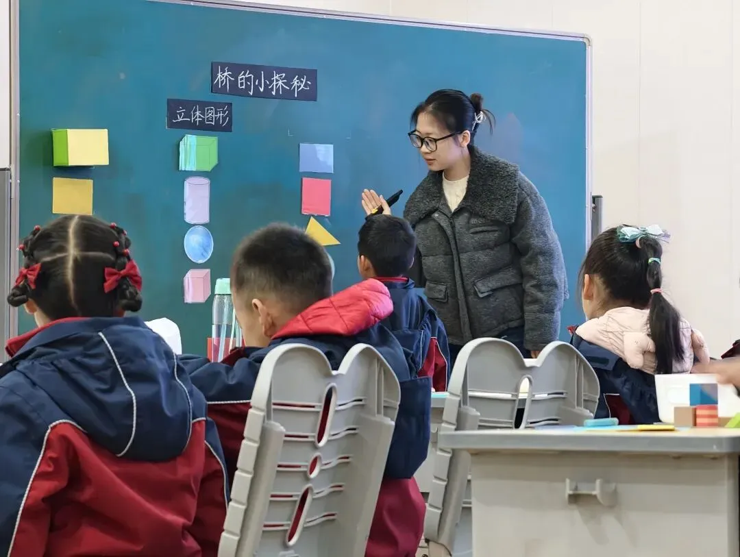 低段课堂以“桥的小探秘”为主题,结合苏教版教材一年级的立体图形知识点,通过直观的几何模型,引导孩子认识桥的结构中长方体、正方体、圆柱等立体图形的特征,对比辨析一下教材的平面图形,搭建数学与空间认知以及生活实际的桥梁。