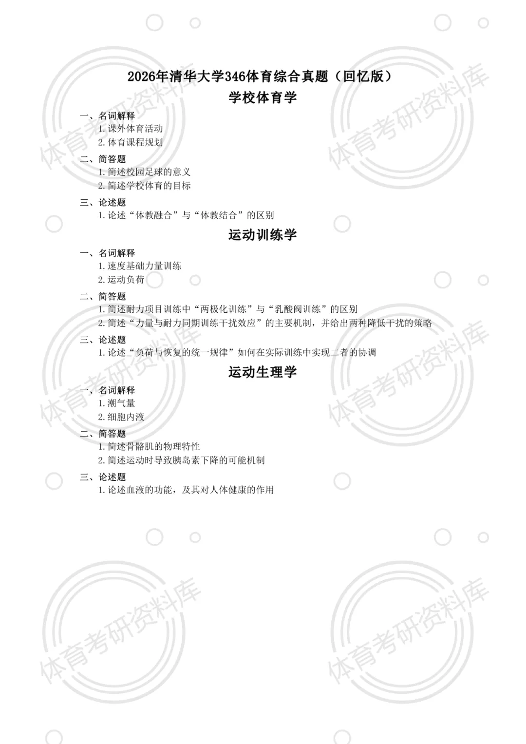 今天给大家分享的是清华大学346体育专硕考研真题考研真题(回忆版)仅供大家学习交流使用