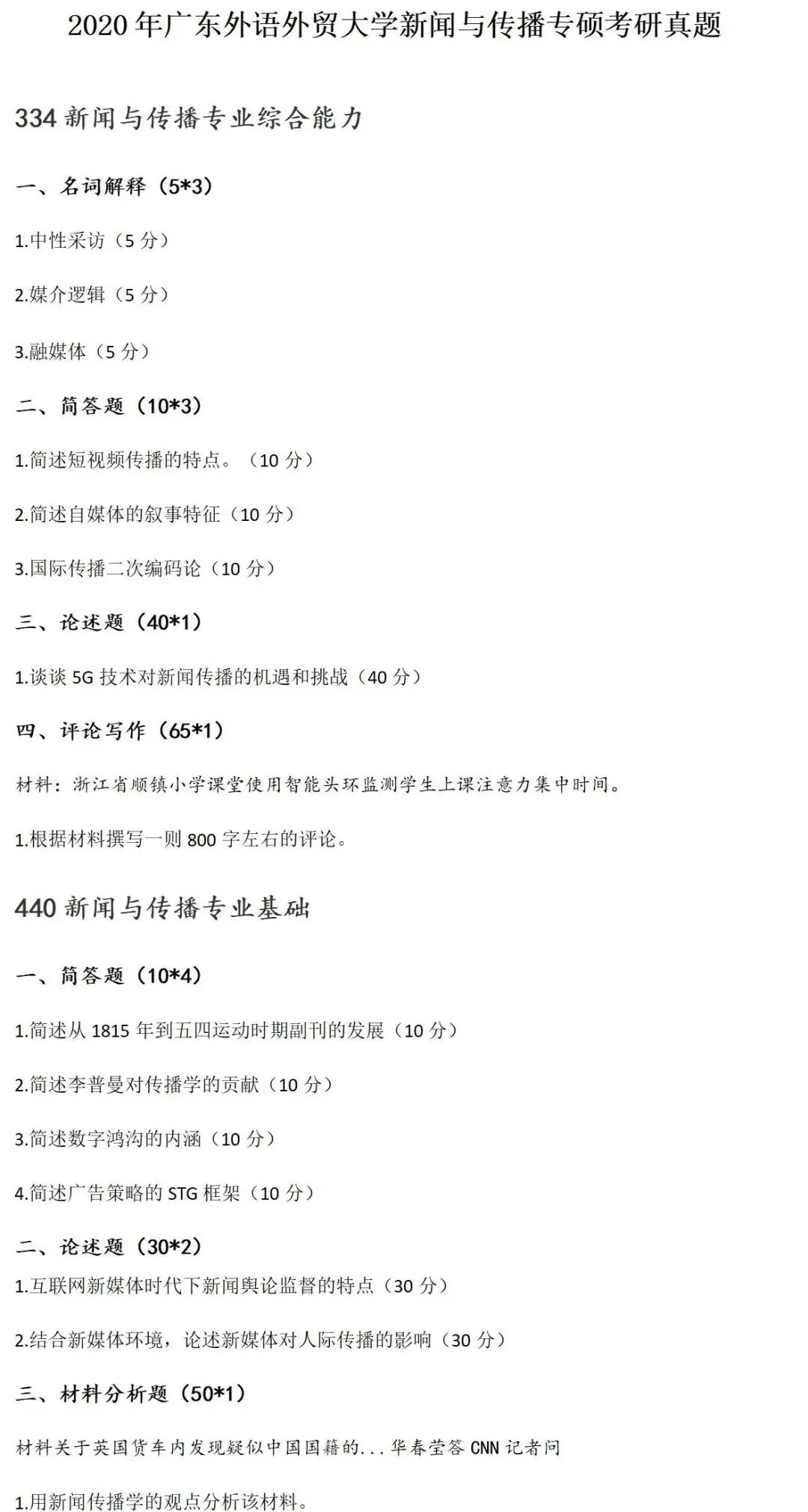 >广东外语外贸大学新闻与传播考研真题2020