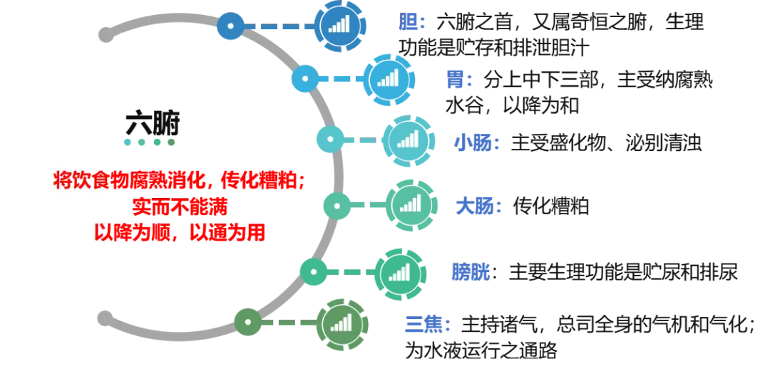 六腑:胆、胃、小肠、大肠、膀胱、三焦合称六腑。