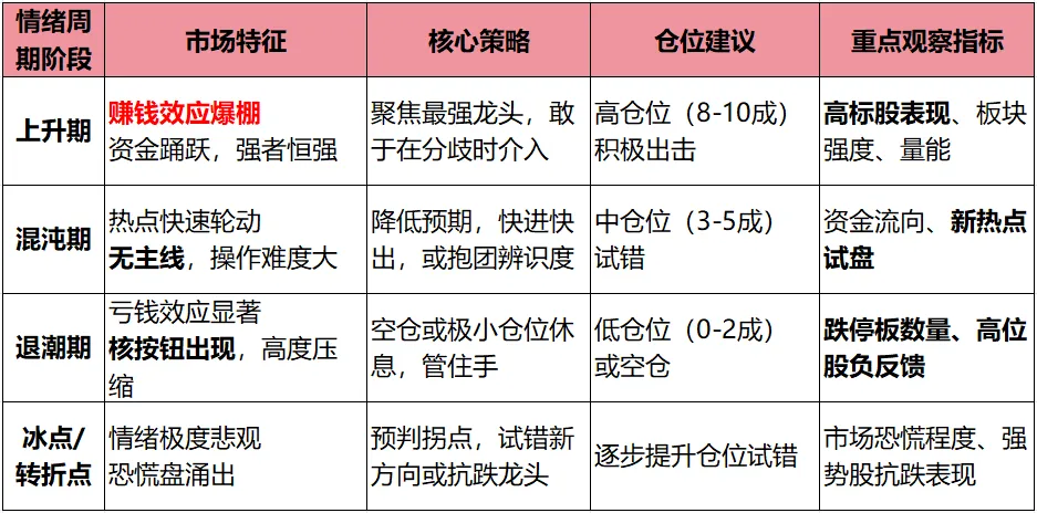 ★龙头就是领涨且不需要看任何人眼色,势大力沉舍我其谁,市场合力绕不开,得散户者得天下。★龙头就在众目睽睽之下;龙头就在大摇大摆之中;龙头就在街头巷议之间;龙头就在口口相传之畔。★龙头也是普通股票,只是在特定阶段因“天时地利人和”成为龙头。★龙头的原始状态仍是普通股票,分歧和调整该来都会来。★龙头早一天,晚一天,差别巨大,云泥之别。跟票没关系,跟节奏的关系更大。★如何识别龙头?首先:预判什么板块会起行情,将板块内走得比较好的几只股放自选,当天主动性最强的那只,列入重点交易对象,如果它拉升板块其他股一起跟,那它就是日内龙,就切换过去。还有一种就是已经走出来的市场公认的龙,板块调整的时候,切换低吸进。★龙头都是情绪节点转折的时候出现,或者是涨到唯一性的时候。再配合一些其他共振的因素。★唯一性在大退潮的时候不能用,因为不是主流的时候,涨到唯一性是用来出货的。★控制回撤是生命线:亏33%需赚50%回本,亏50%需赚100%回本。★情绪分歧时注意后排掉队风险,情绪修复时把握回暖机会。★上升期(赚钱效应主导,可积极做多)、混沌期(市场无主线,尽量抱团或休息)、退潮期(亏钱效应主导,注意风险,管住手)。★情绪周期(如退潮-冰点-混沌-主升)并非固定公式,可能存在“冰点之后再冰点”。需考虑市场量能、涨停家数、跌停家数等动态评估和推演,而非刻板套用。★关键指标:高度关注跌停板数量(尤其核心标的)、高标股表现、昨日连板/涨停指数、市场温度等。★择时 > 择股:在正确的时机(情绪冰点、转折点)交易,比选择什么股票更重要。★聚焦最强:永远不要在掉队和弱者里交易,只做核心主线,核心逻辑,核心个股。★不求暴力增长,只求稳定复利!尊重共识,哪怕傻x的共识也是共识!★信就早信:对所有新题材,早信的人赚钱,晚信的人买单。★上升期:敢于在分歧时介入龙头,因为好票一字买不到,分歧才给机会。★退潮期:空仓或极小仓位运作是上策。谨慎博弈“活口”,这如同“大部队被歼灭后指望一个人打赢战争”。★混沌期:最容易亏钱的阶段。因此时刚从赚钱效应出来,心态易膨胀,且容易出现“好买点”陷阱。需降低仓位和预期,快进快出。★仓位一致性。避免在行情好时畏首畏尾,行情混沌时却下重仓。建立一套一以贯之的仓位管理规则。★警惕高风险行为。“送钱排行榜”:搞卡位、退潮期做活口、低位试错博弈龙头(成功率低)、高位退潮顶一字或买加速(天地板源泉)。★回避“买一独大”。除非市场极好,否则回避被单一游资重仓包场的股票,这通常不是市场合力,一旦风吹草动容易崩塌。★买在分歧(未证伪的分歧),卖在一致(已证伪的一致)。★转债套利模式:若正股涨停瞬间,他的转债还是没涨甚至负溢价的,可以第一时间买入他的转债套利。★量化已成为市场重要力量,而人的优势在于主观预判。应提前预判可能启动的方向,一旦预判正确,量化资金也会后续涌入,为你抬轿。★量化路径:催化→涨不动就切低位→切不动就退潮→调整好再涨。量化主导下,行情节奏更快。3.复盘★交易复盘:深度解析每日每周交割单,纠正交易缺陷。★行情复盘:深度解析本周涨得好的股票,提高审美(它为什么涨得好?我下次如何能买到?)。★制定计划:基于复盘,做好次日交易计划,盘中严格执行,避免临时起意!