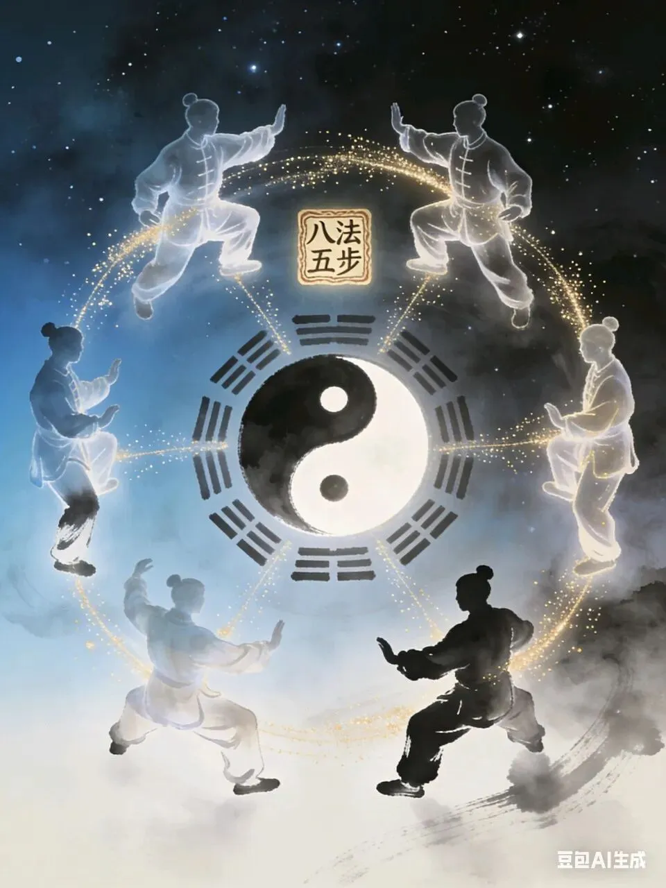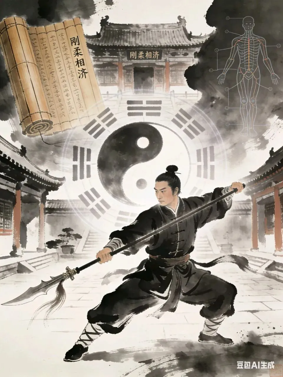 - 阴阳转化:这是“以柔克刚”的本质。当对手用刚劲进攻(阳)时,我们不是以刚抗刚,而是用柔化引开(阴),让对手的力量落空、逐渐消耗(阳转阴);再顺势发力,实现“柔转刚”(阴转阳),这就是“四两拨千斤”的智慧,也是《周易》“穷则变,变则通”的生动实践。