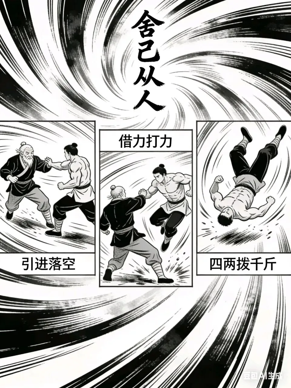 - 道家“无为而治”:核心是“舍己从人”——不固执于自己的招式,顺应对手的动作与力量方向,通过“粘、走、化”的技巧,引导对手的力量落空,使其失去平衡。这就是“顺势而为”,用最小的力量实现最大的效果。
