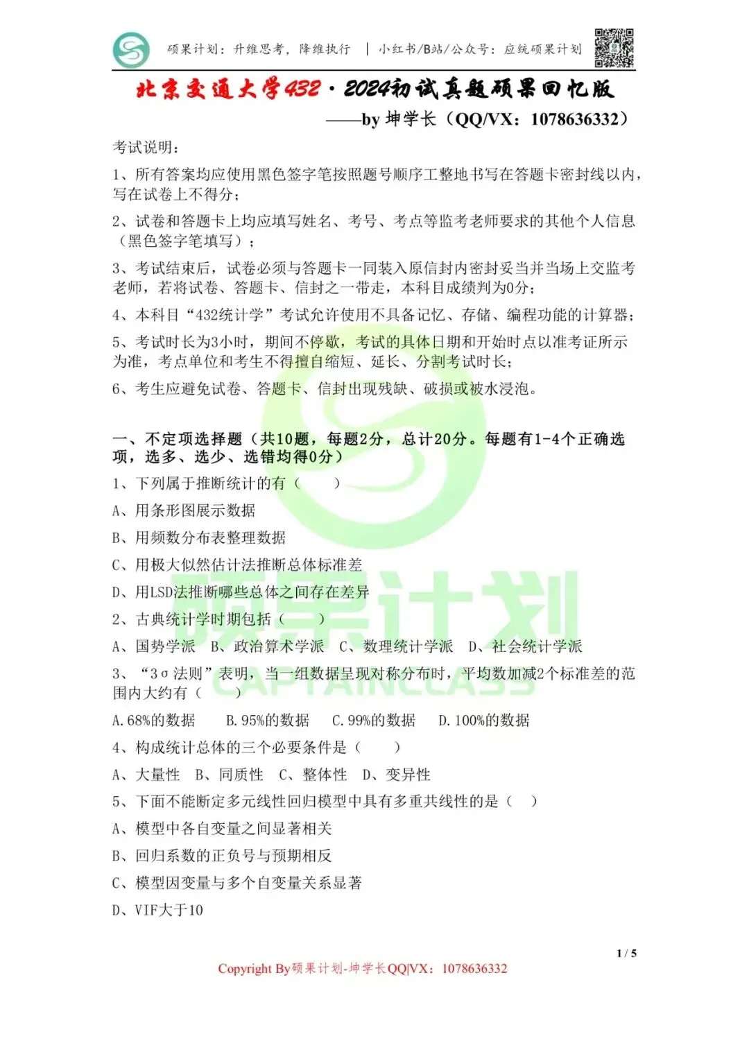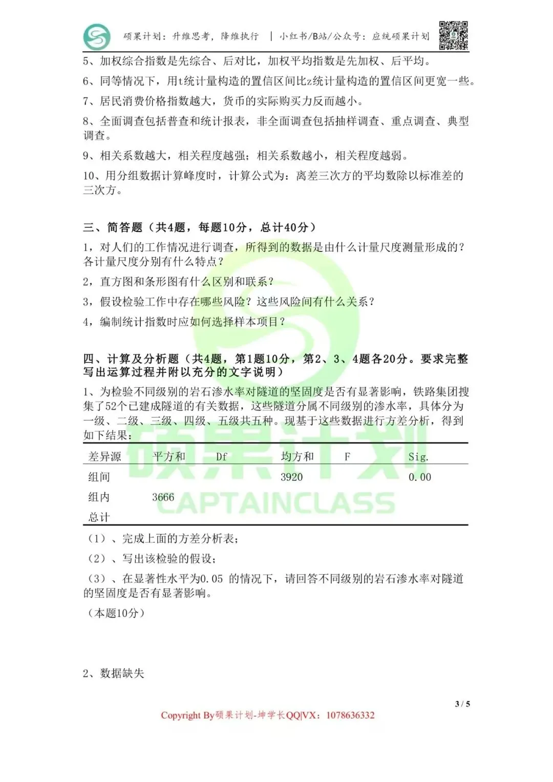第一部分:描述统计理解数据的计量尺度和类型,系统掌握统计调查方案的内容,并能根据特定的调查内容设计具体的调查方案;掌握统计调查的具体方法以及不同方法的特点及适用条件;掌握数据质量评价标准;数据误差的生产及控制;重点掌握统计数据的整理及显示方法,能够运用所学习的方法将原始数据整理成适当的频数分布表,并能利用图形显示统计数据;掌握统计表的构成内容和设计方法。掌握集中趋势和离散程度的各个代表值的含义、特点、应用条件,以及它们之间的相互关系,并能根据已知条件,熟练地计算各个代表值,并运用这些代表值分析具体问题。