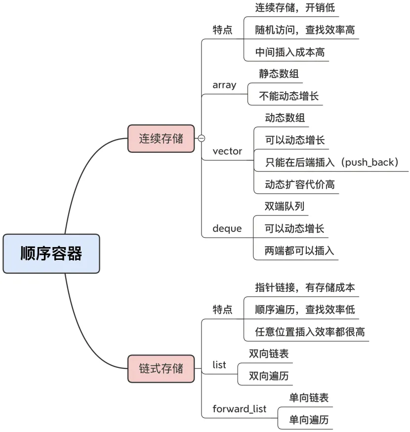 vector 和 deque 里的元素因为是连续存储的,所以在中间的插入删除效率就很低,而 list 和 forward_list 是链表结构,插入删除操作只需要调整指针,所以在任意位置的操作都很高效。