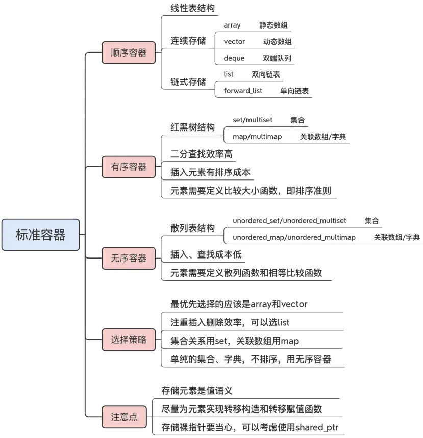 如果没有什么特殊需求,首选的容器就是 array 和vector,它们的速度最快、开销最低,数组的形式也令它们最容易使用,搭配算法也可以实现快速的排序和查找。